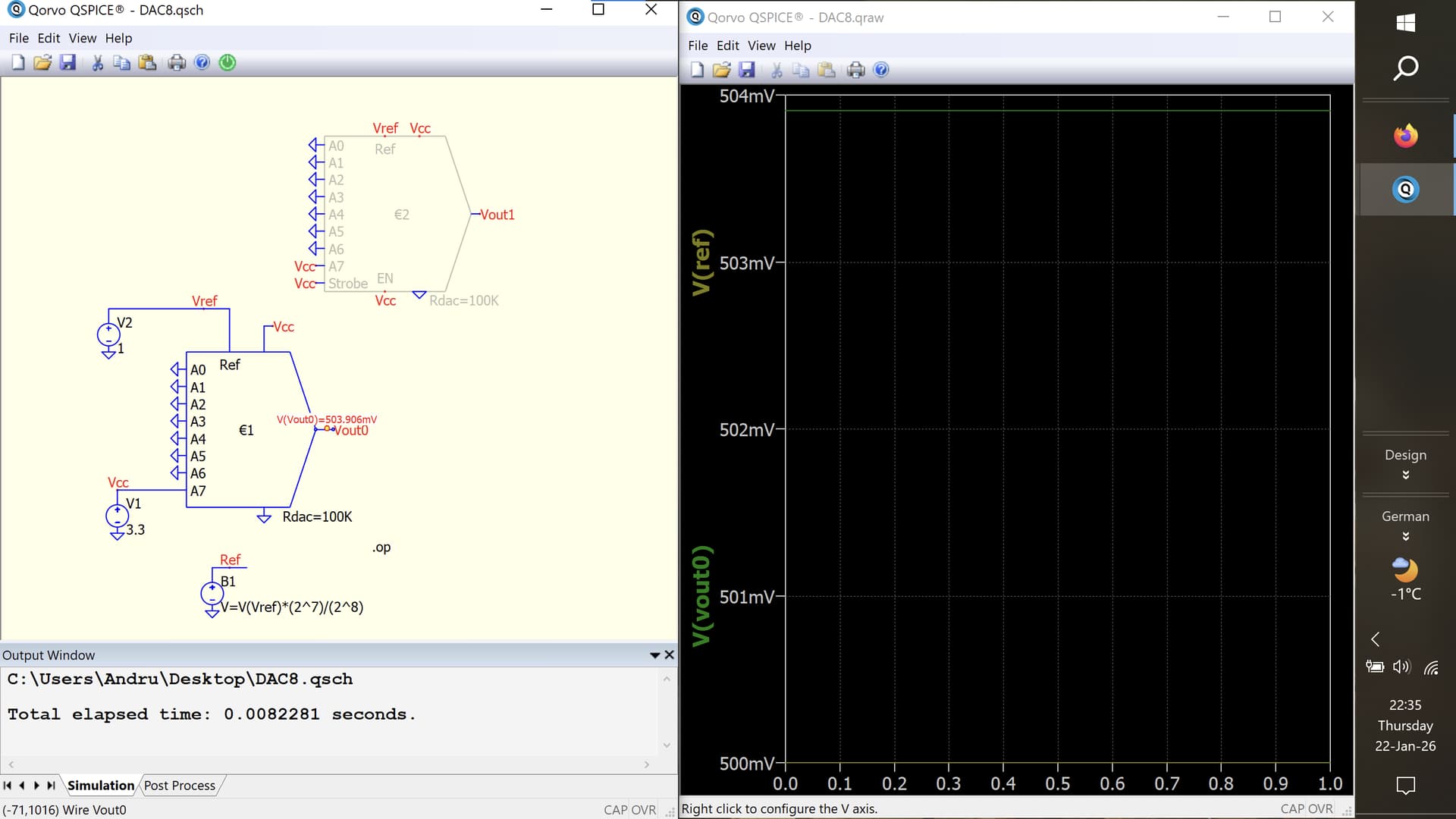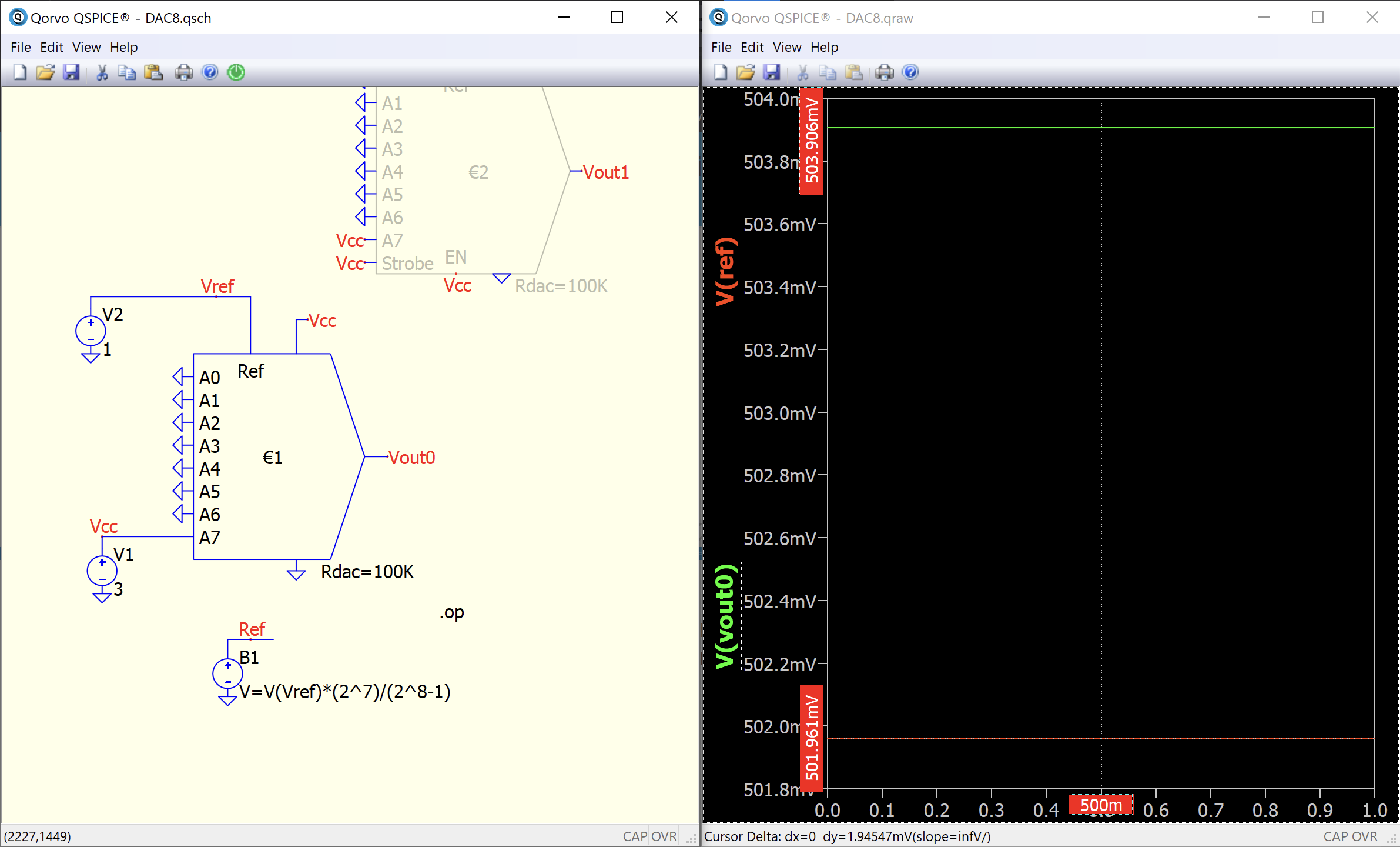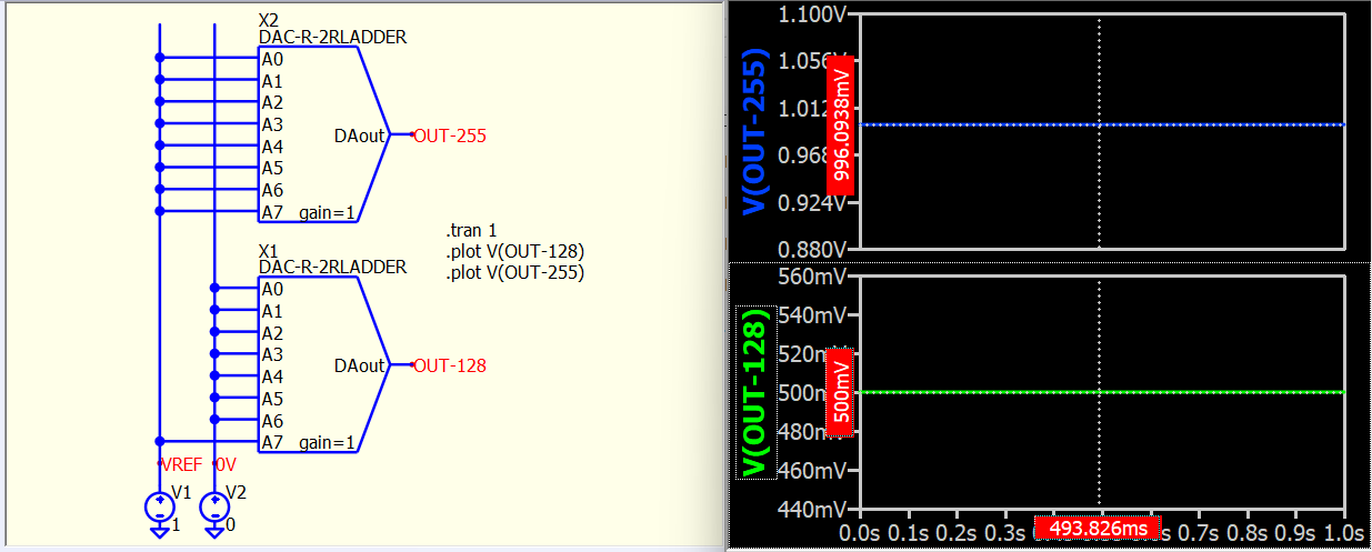 Firstly, I noticed something yesterday and checked with Mike. He confirmed that in Qspice, the DAC is supposed to range from 1/256 to 1, and he will update the documentation to reflect this. If you input ‘00000000’, you will get a non-zero output from this DAC. This is not a typical R-2R formula to expect.