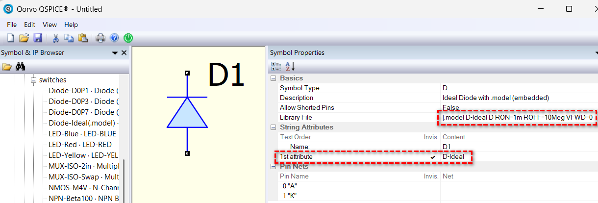 The concept is that we can place a .model statement in the Library File in Symbol Properties. An additional character | needs to be added in front of the .model statement for an embedded .model. I hide the first attribute (model name) and change the color of the triangle to indicate that it is something special for visual purposes. With a symbol like this, you can avoid typing the .model statement every time you need the ideal diode.