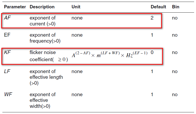 Just checked the Hspice manual, and the default values are AF=2 and KF=0 (flicker noise disabled). So, maybe you can check with Mike to see if AF should follow the default value in Hspice as 2 instead of 1.