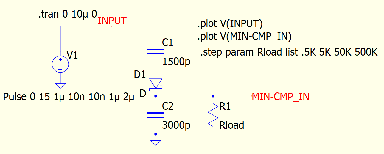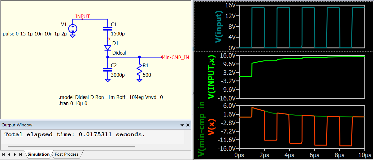 I’m seeing unexpected behavior when simulating with square wave input into capacitor voltage divider. The circuit behaves as expected with only the capacitors, but as soon as I add the diode and resistor the simulation output does not make sense to me anymore.
