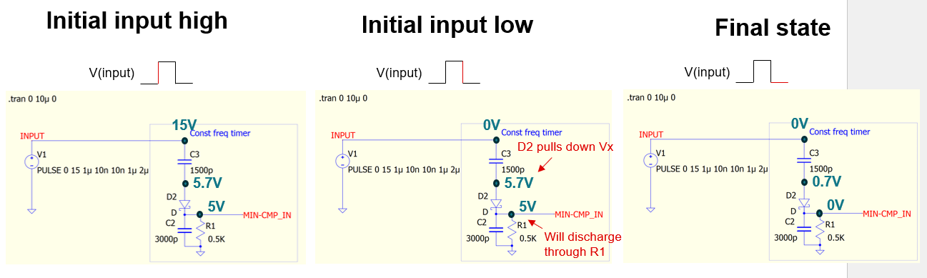 For the graph that initial input low, did you consider the fact that C3 already charged with 15V - 5.7V = 9.3V, and where this voltage goes? (let assume using value in your graph)