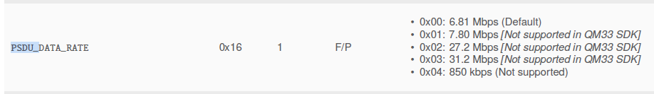 - The QM33120W datasheet mentions that it supports 850kpbs data rate. I know that the default psdu_data_rate supporting is 6.81Mbps, but I am not able to come across the option to change the PSDU_DATA_RATE.