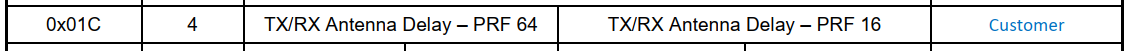 In the deca_driver functions dwt_settxantennadelay and dwt_setrxantennadelay, they accept 16-bit unsigned values, so each RX and TX antenna delays are 16-bits. But according to the register map in OTP memory, each antenna delay would be 8-bits since they are storing TX/RX for both PRF 64 and PRF 16 in only 4 bytes…
