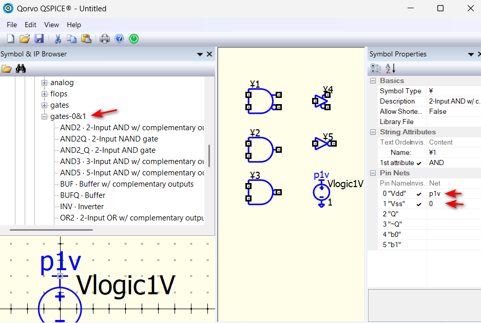 With all these, my setup is now look like no Vdd or Vss pins, but actually they have that as they are just a varient of standard Qspice ¥-device.
