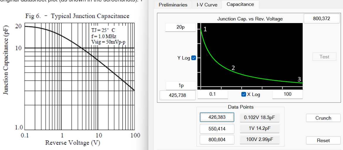 I’m using the Diode Model Generator to digitize a Capacitance vs. Reverse Voltage curve. However, I encountered a strange issue where the generated data points do not align with the original datasheet plot (as shown in the screenshots).: