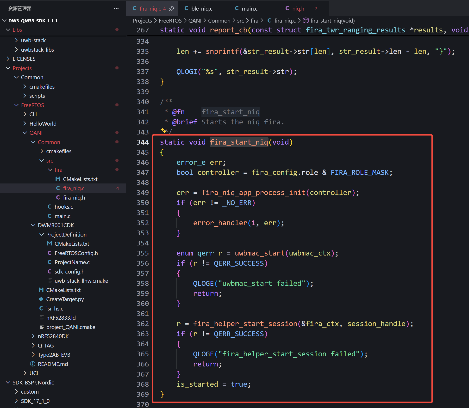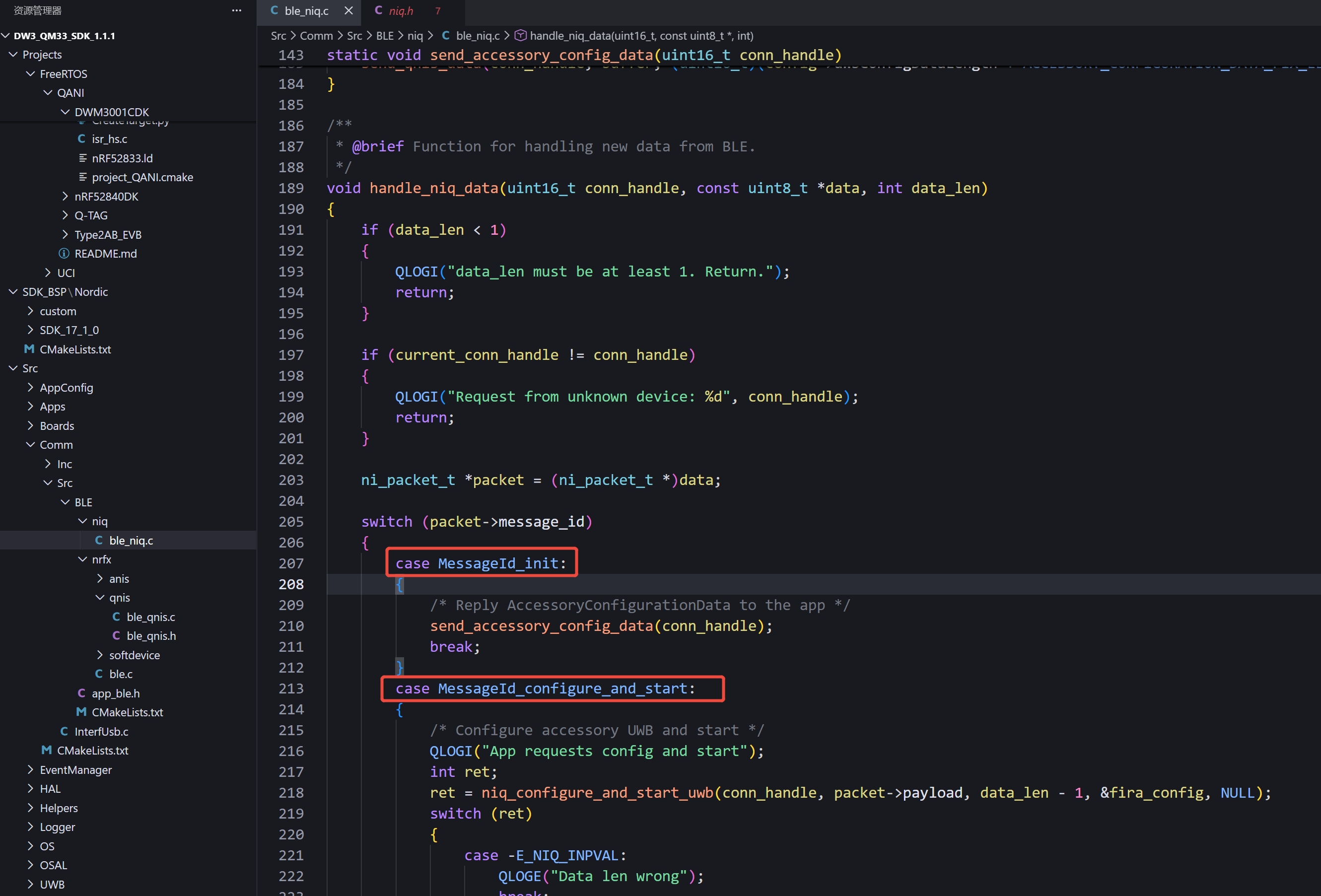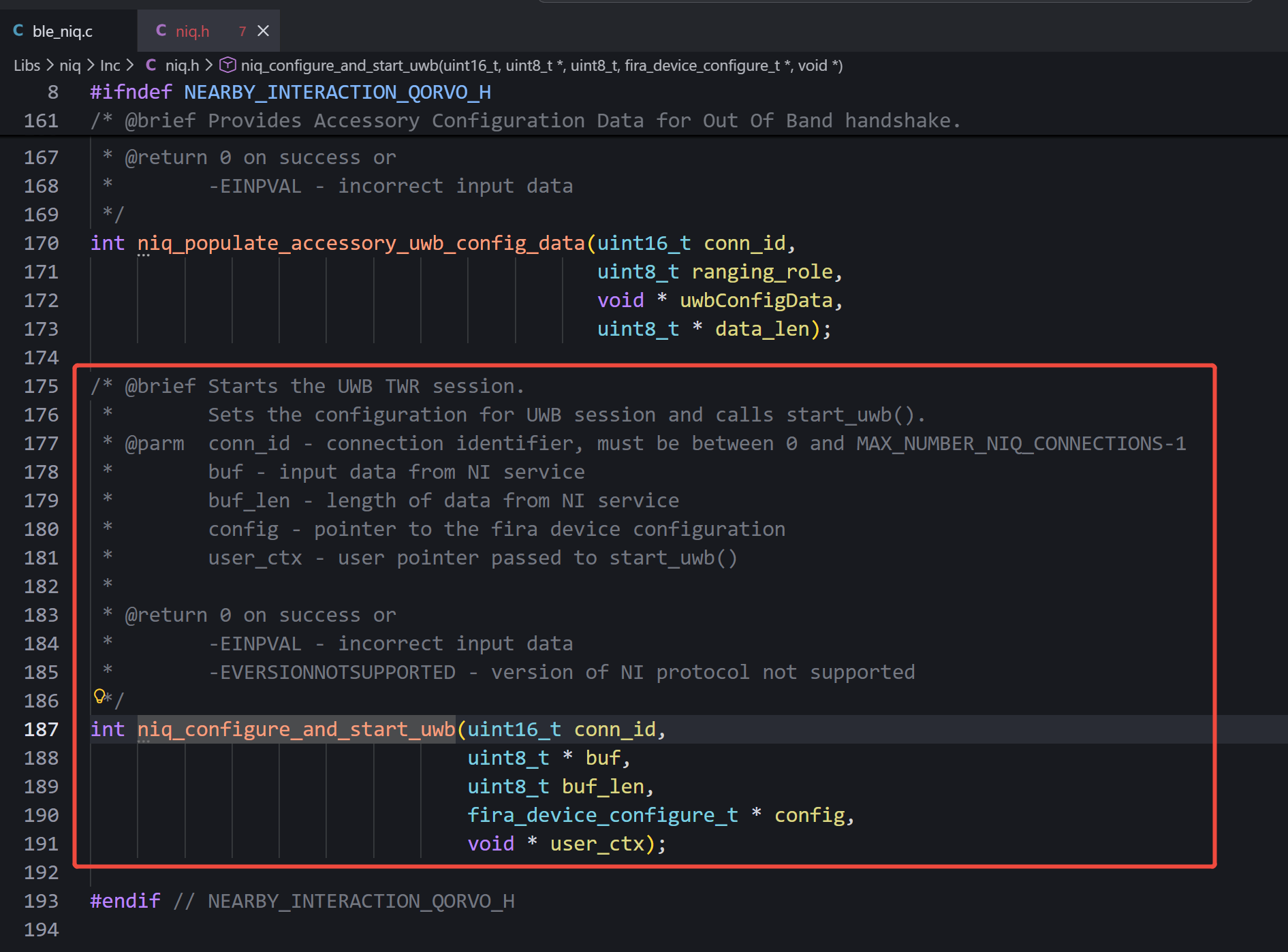 Upon receiving the configure_and_start command, the SDK will execute the niq_configure_and_start_uwb() function as shown below.