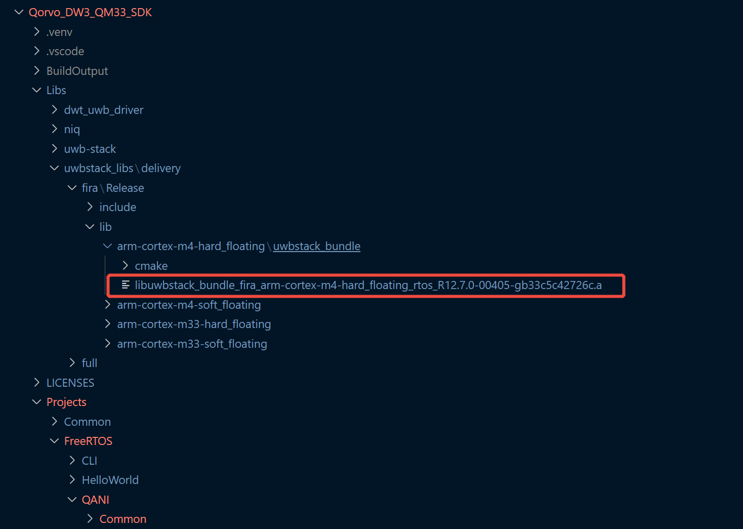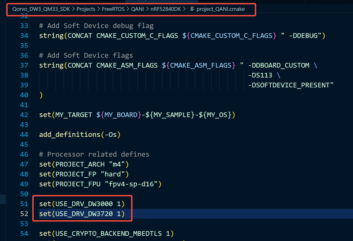 In this cmake file, set USE_DRV_DW3000 and USE_DRV_DW3720 to 1 to enable DW3000 and QM33110 driver.