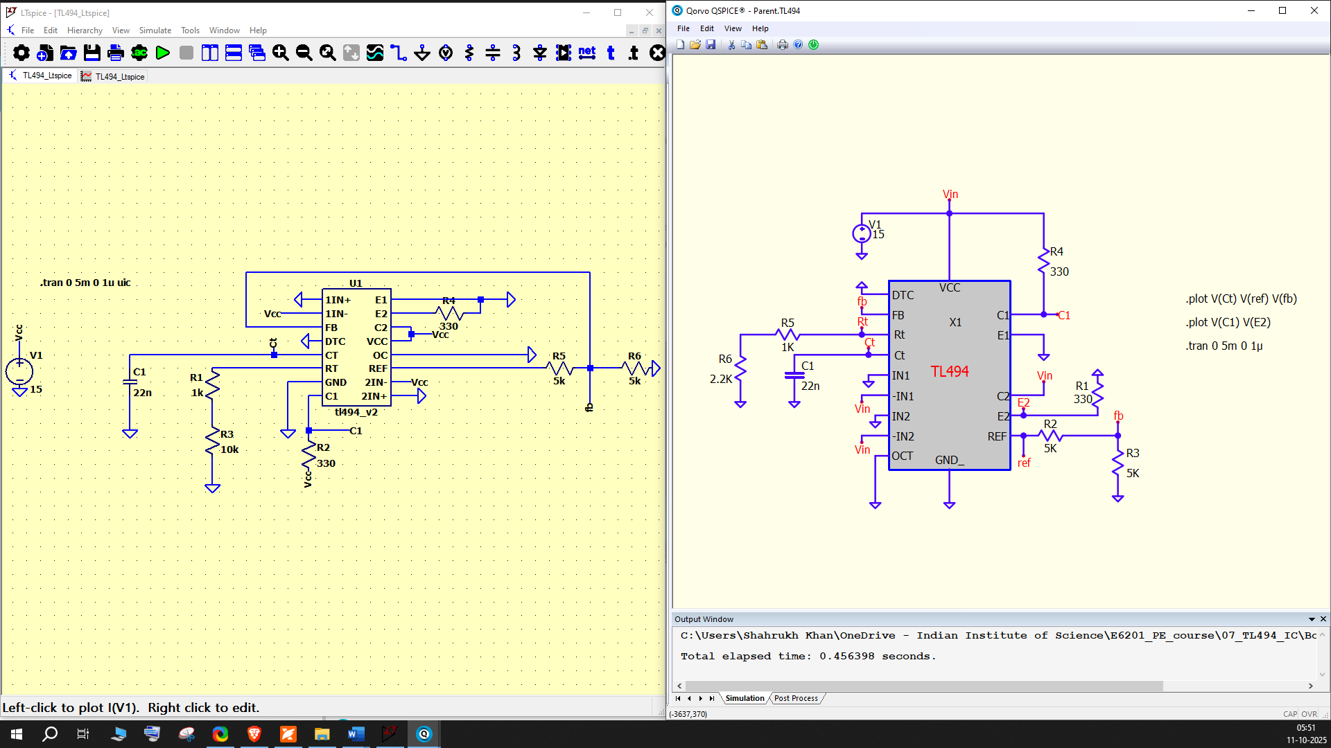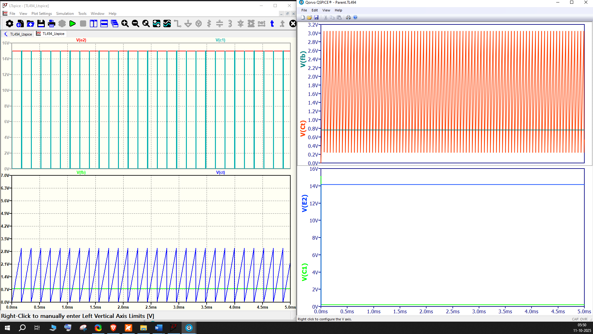 I am trying to simulate the TL494 PWM controller in both LTspice and QSPICE, using the same SPICE subcircuit and component values. However, I’m seeing a clear difference in the simulation results.