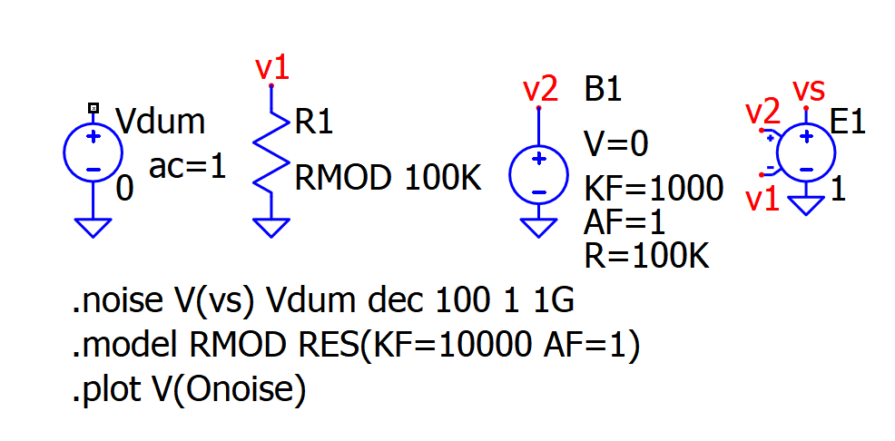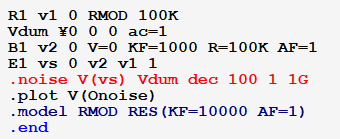 I am trying to generate flicker in a noise analysis with either a resistor or behavioral source using the KF and AF parameters. But only thermal noise shows up in the plot.