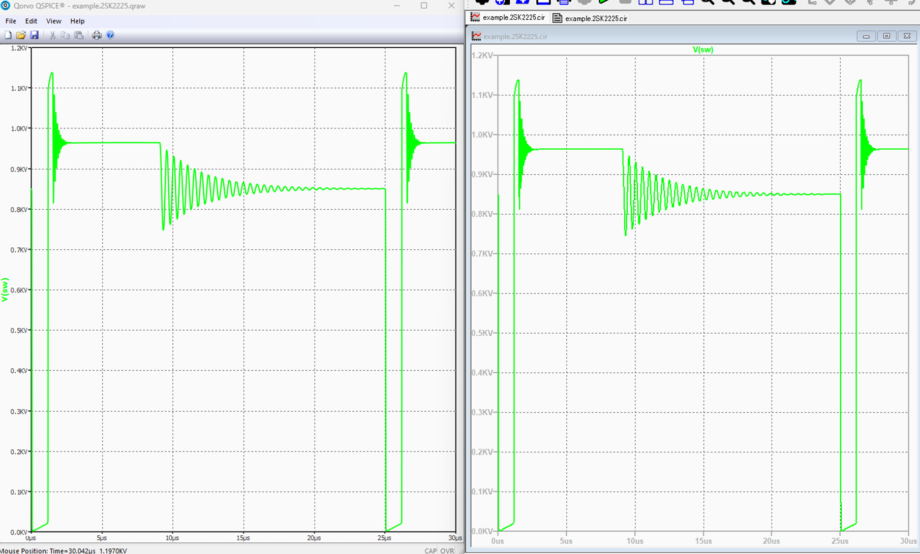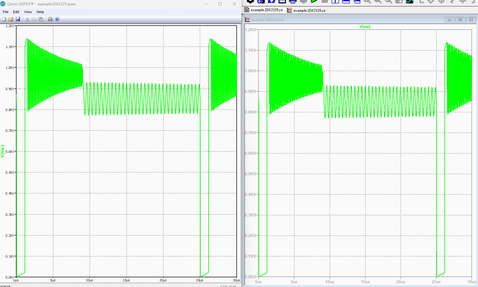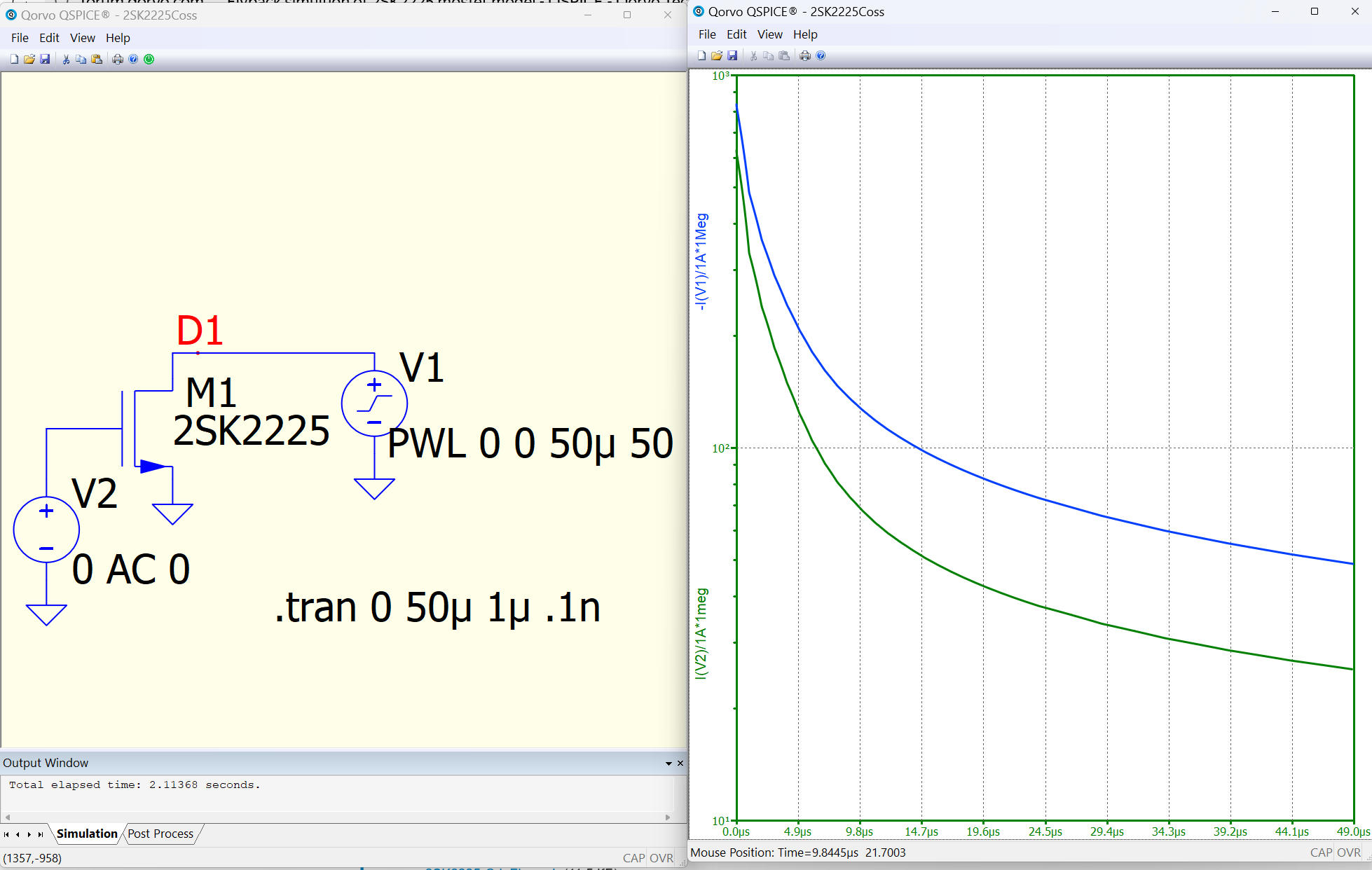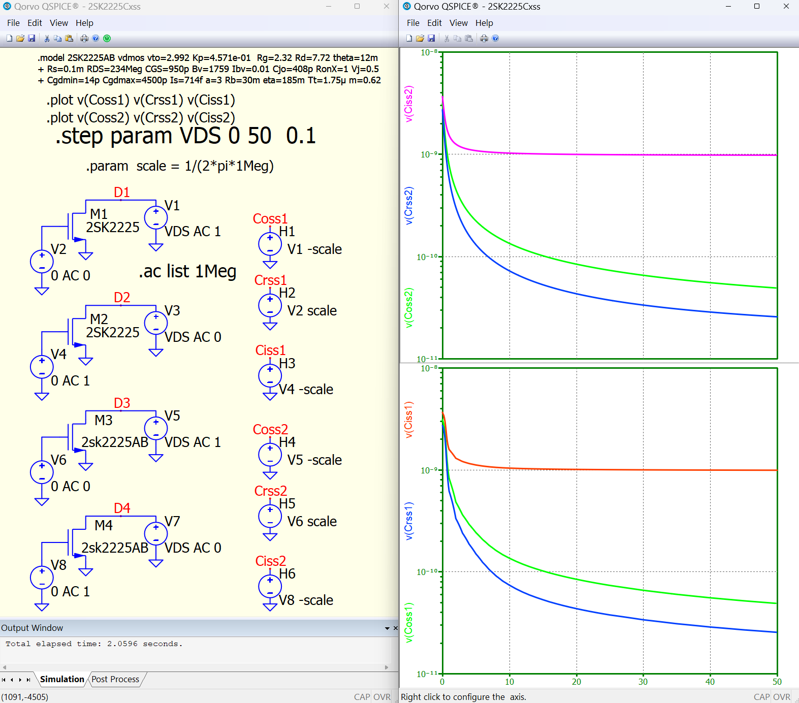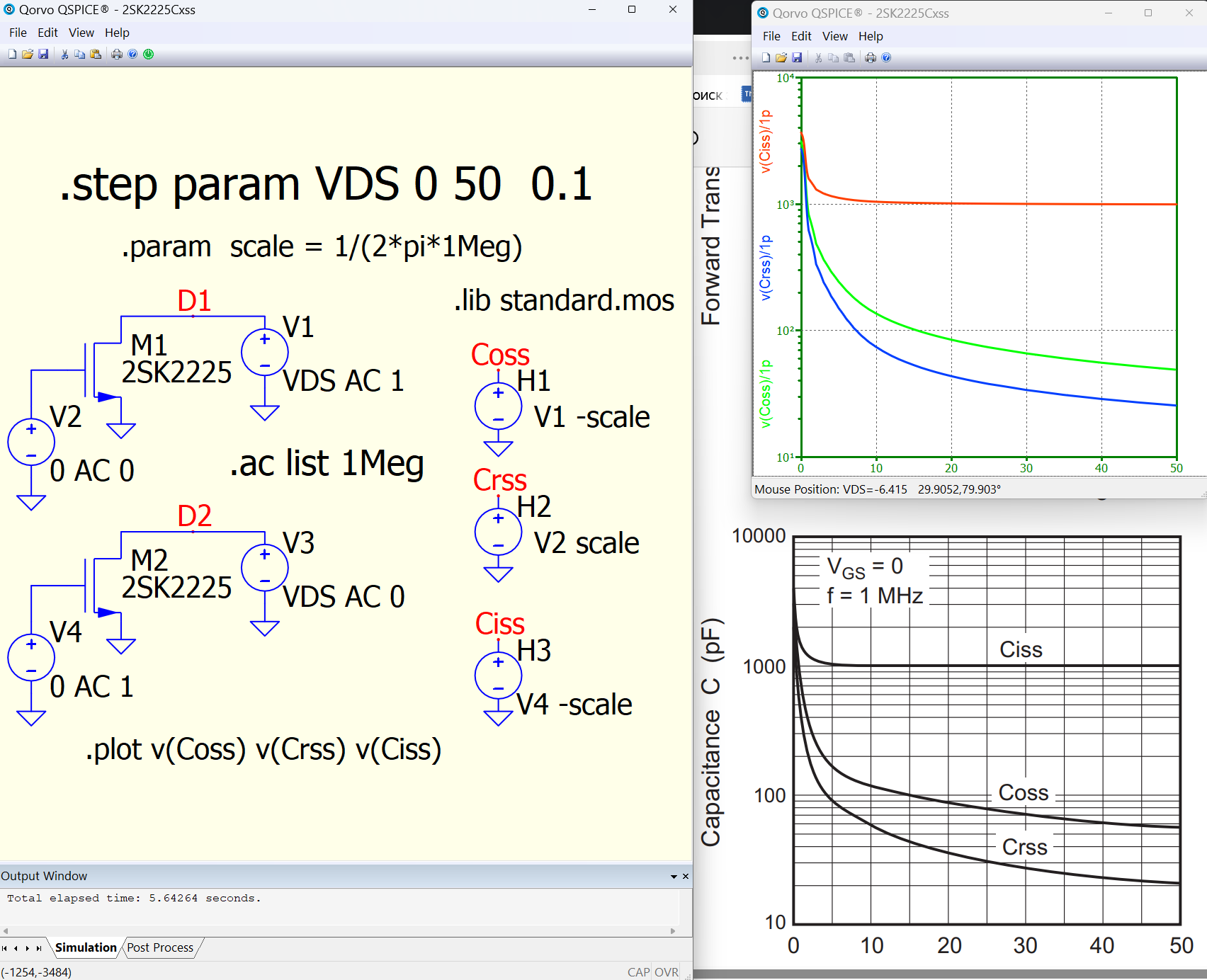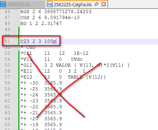 Here, I removed the Cdg portion from the 2SK2225 netlist, replaced it with a fixed 100pF capacitance, and both simulators returned the same result. So, the difference seems to be somewhere in there. I’m not saying which one is right and which one is wrong, but it should be related to the different calculated results from this part of the circuit in the 2SK2225.