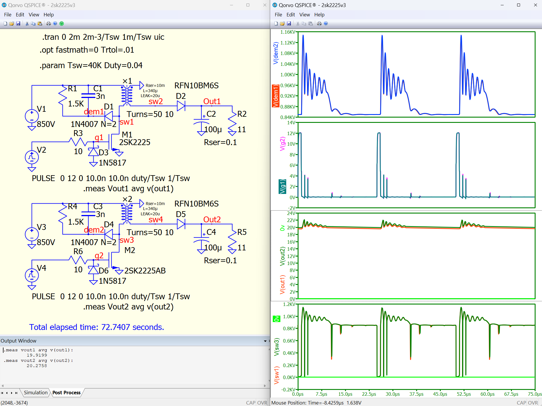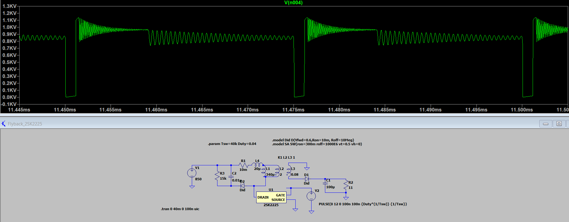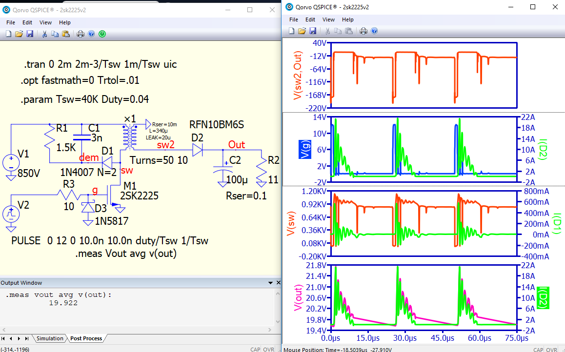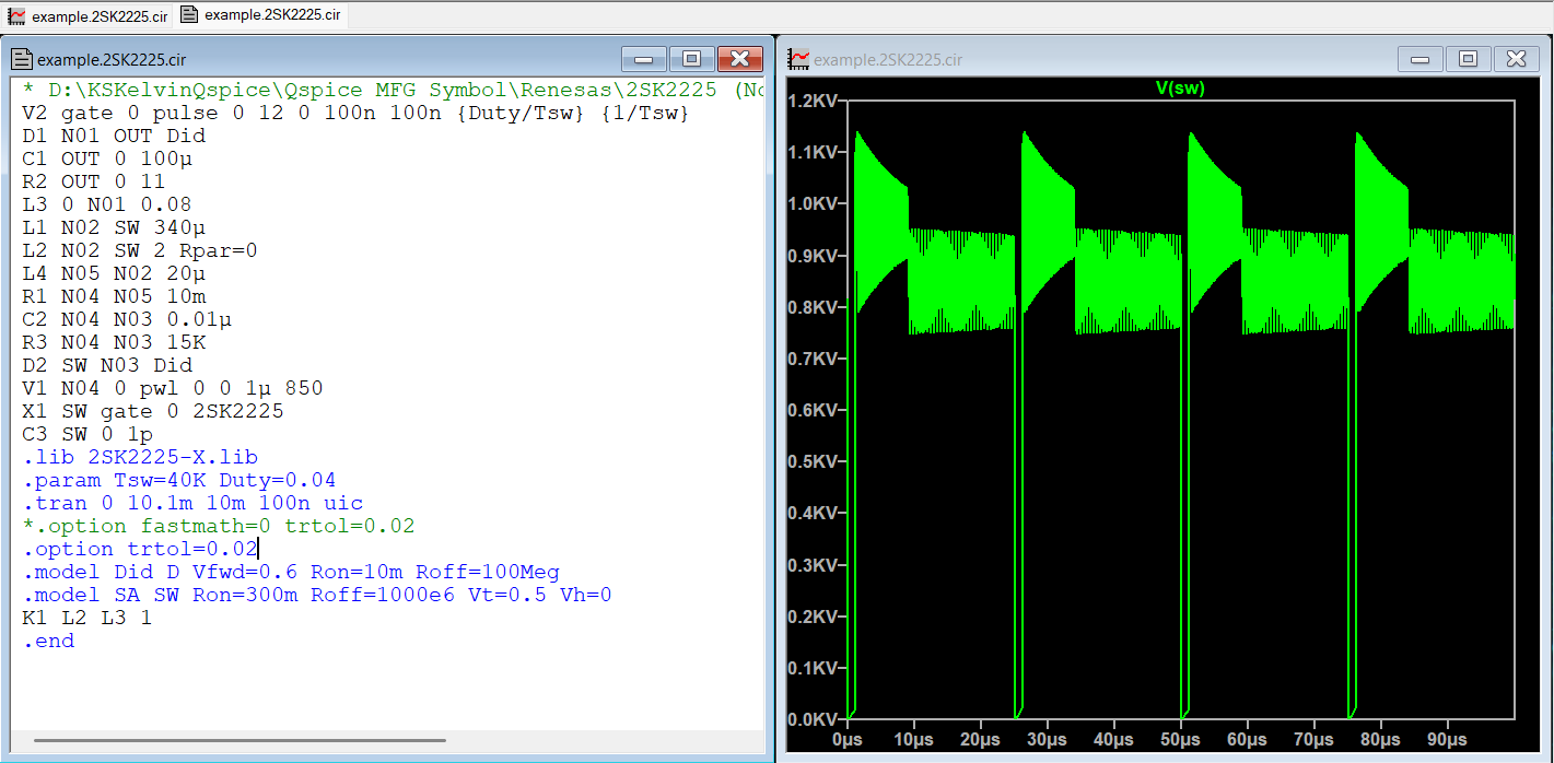 I am tried to simulate a flyback convert with the spice mdodel of the 2SK2225, an Nch Power MOSFET 1500V 2A 12000mohm.