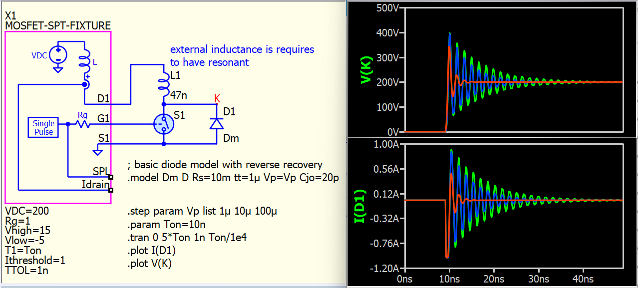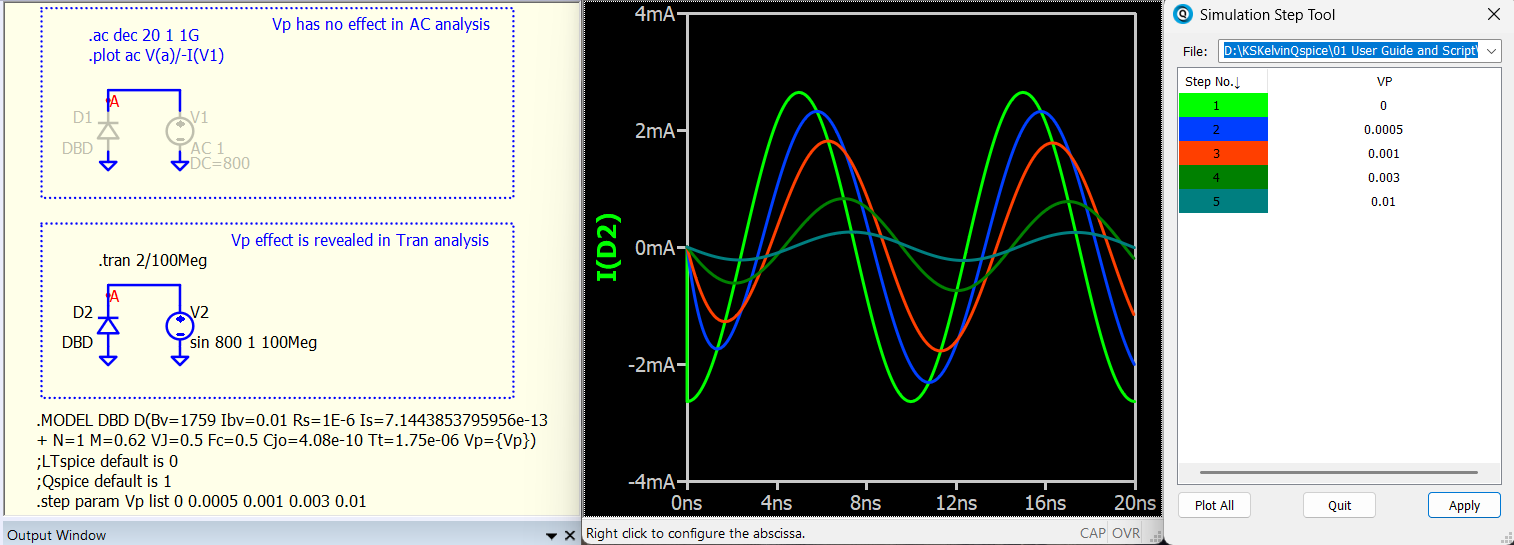 Here is my speculation: Parameter Vp is the “dQ/dt damping parameter for diffusion charge.” We observe that the current is quickly damped during the ringing duration with Vp=0.01, and possibly this damping parameter is in effect during this AC current ringing. The diode is reverse biased, and this ringing is expected to flow through the junction capacitor. Vp may also play a role in damping this current. Currently, I haven’t set up conditions to prove it. I am simply sharing the technique to delve deeper.