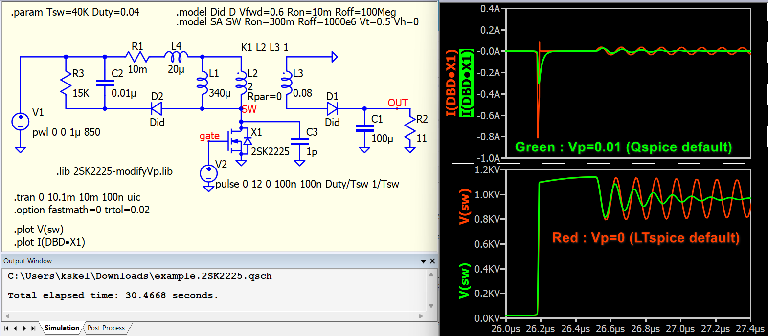 @bordodynov Initially, I had the same suspicion. I built a schematic following @kss’s schematic, with Rpar=0 for L2, ran it in Qspice, exported this schematic to a .cir file, and ran it in LTspice. They exhibited different ringing behavior. I observed that the drain-source capacitance plays an important role in the nature of this ringing, and the 2SK2225 model includes its drain-source (or drain-gate) capacitance with a look-up table. It may be somehow related to that aspect.