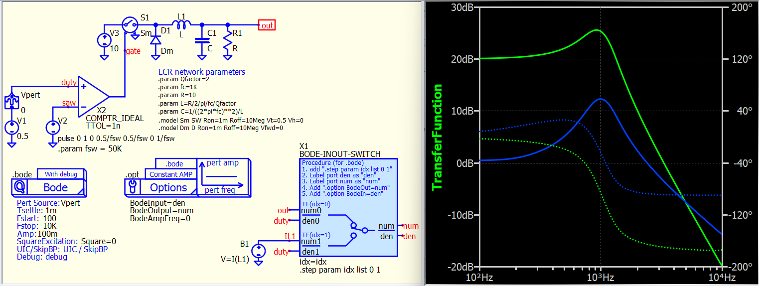 - .bode : use a perturbating source to inject ac signal and run time domain simulation, use FFT to get frequency response from time domain data. This technique is normally for switching circuit