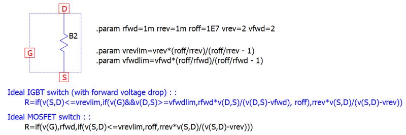 So, anyway I tried making a ideal MOSFET model (and IGBT too) including the body diode using Behavioral Resistor.