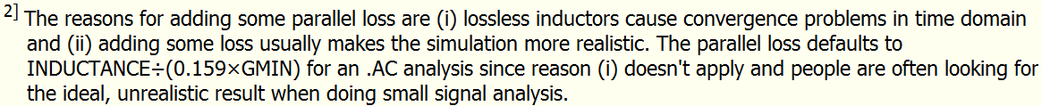 Not infinite… In .tran, the default Rpar changed from L/15.91/Gmin to L/1.591/Gmin, i.e., increased by 10 times. In .ac, the default Rpar is L/0.1591/Gmin, i.e., increased by 100 times as compare to past. LTspice damping is much less. Possibly (I guess), many people are asking Mike why LTspice and Qspice do not match and eventually Rpar is reduced. I don’t think such a high Q is common (or even can be done) in power electronic. But there is another group of users who seem to work in a specific field with very high Q.