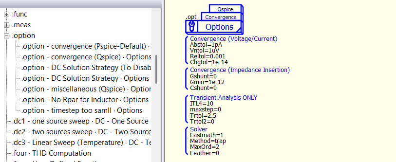 Well, where can I find your proposed symbols? I can create those symbols to match the corresponding devices’ layout in Qspice so that others can drag them into their projects for verification (matching layout allow delete default device and add your proposed symbol without adjusting any wire). Additionally, I can create a .option symbol to quickly set the .option you proposed. Something like this.