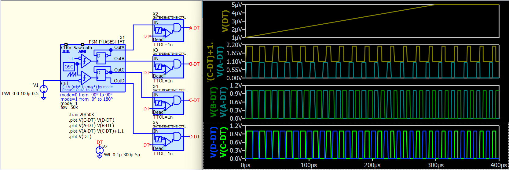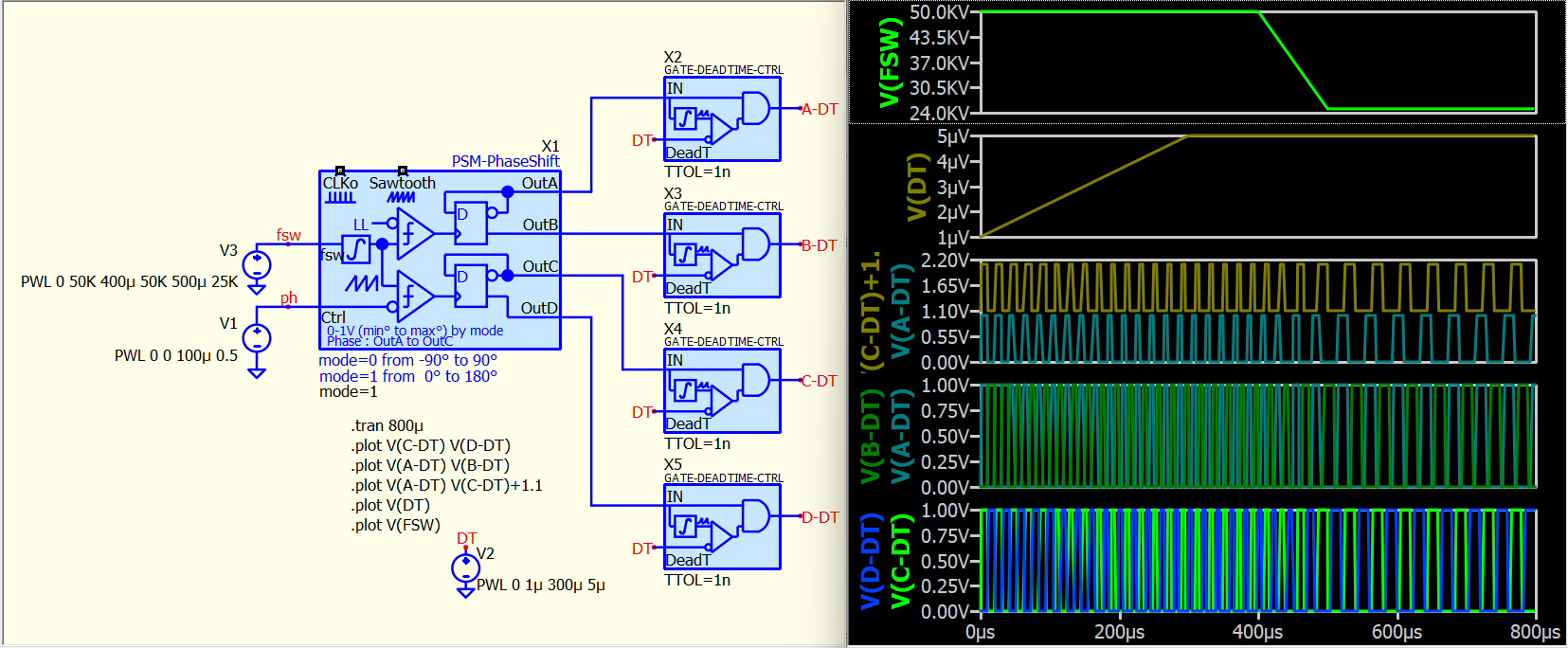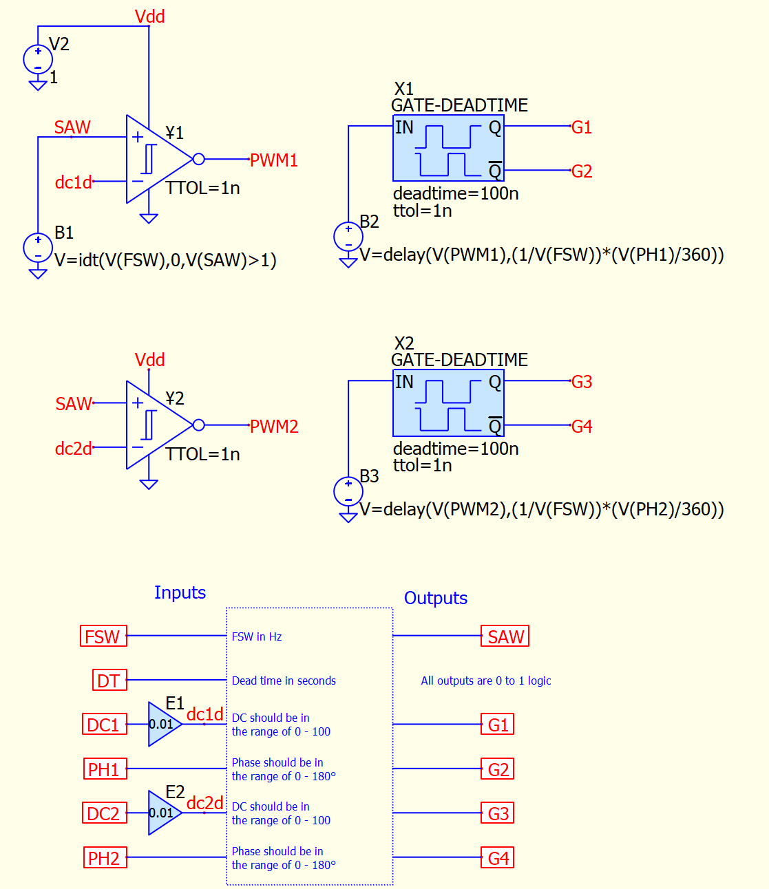 The solution you have just posted is now missing the dynamic change of FSW. In my case, I want to make a PWM modulator for SMPS applications where I need to dynamically change the FSW, duty cycle, dead time and phase shift during simulation. I have done it in a C-block but I would like to do it in circuit as well.