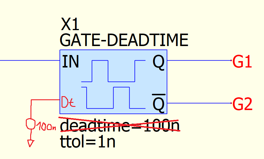 Actually I do have your entire library and I highly appreciate your efforts you have put to build this library. However, this symbol you are suggesting is not for Half-bridge configurations. So, that is why I was wondering if a version of the HB symbol existed and I have missed it. I have seen professor’s’ Alonso LTspice implementation but he uses RC tau which needs also to be “hardcoded”. In the following screenshot you can see what I want to implement and why I need adjustable dead time.