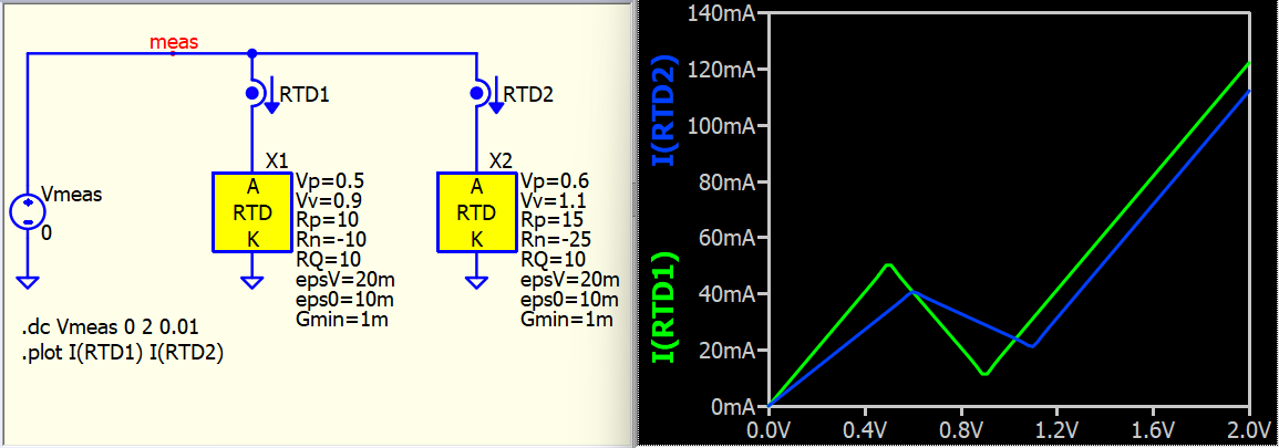I don’t know about Resonant Tunneling Diodes (RTDs) before this post. This device exhibits a peculiar I-V curve. It is challenging to imagine how this device would behave in series, where their currents are expected to be identical. For instance, in the curve below, if 30mA flows through them in series, RTD1 could exhibit voltages of 297mV, 707mV, or 1.089V, while RTD2 could show voltages of 443mV, 871mV, or 1.188V. Consequently, there are 9 possible voltage solutions for 30mA, such as V(RTD1) + V(RTD2) = 297mV + 443mV or 297mV + 871mV, and so on. As you model it with a voltage controlled current source, I think the simulation will struggle in a multiple solutions condition.