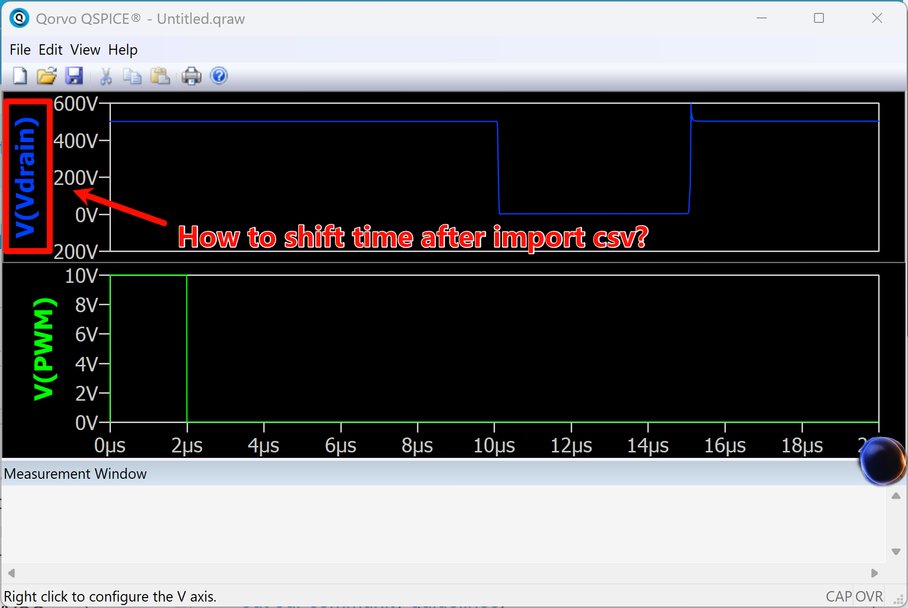 Using the Overlay Simulation function of Qspice has brought me a lot of convenience. However, I want to ask if there is a way to offset the time of the imported waveforms. For example, the Vdrain waveform in the figure is from the csv data measured by my oscilloscope. This way, I can align different waveforms. Additionally, can’t the range of the time axis be modified after running the simulation? For example, I want to change it from 0 - 20us to 0 - 100us.
