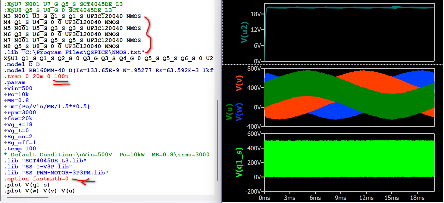 I’ve been working with a three-phase inverter circuit provided directly by the company, which can be implemented in LTspice. While attempting to calculate switching losses, conduction losses, and the overall efficiency of the motor, I encountered convergence errors in the simulation.