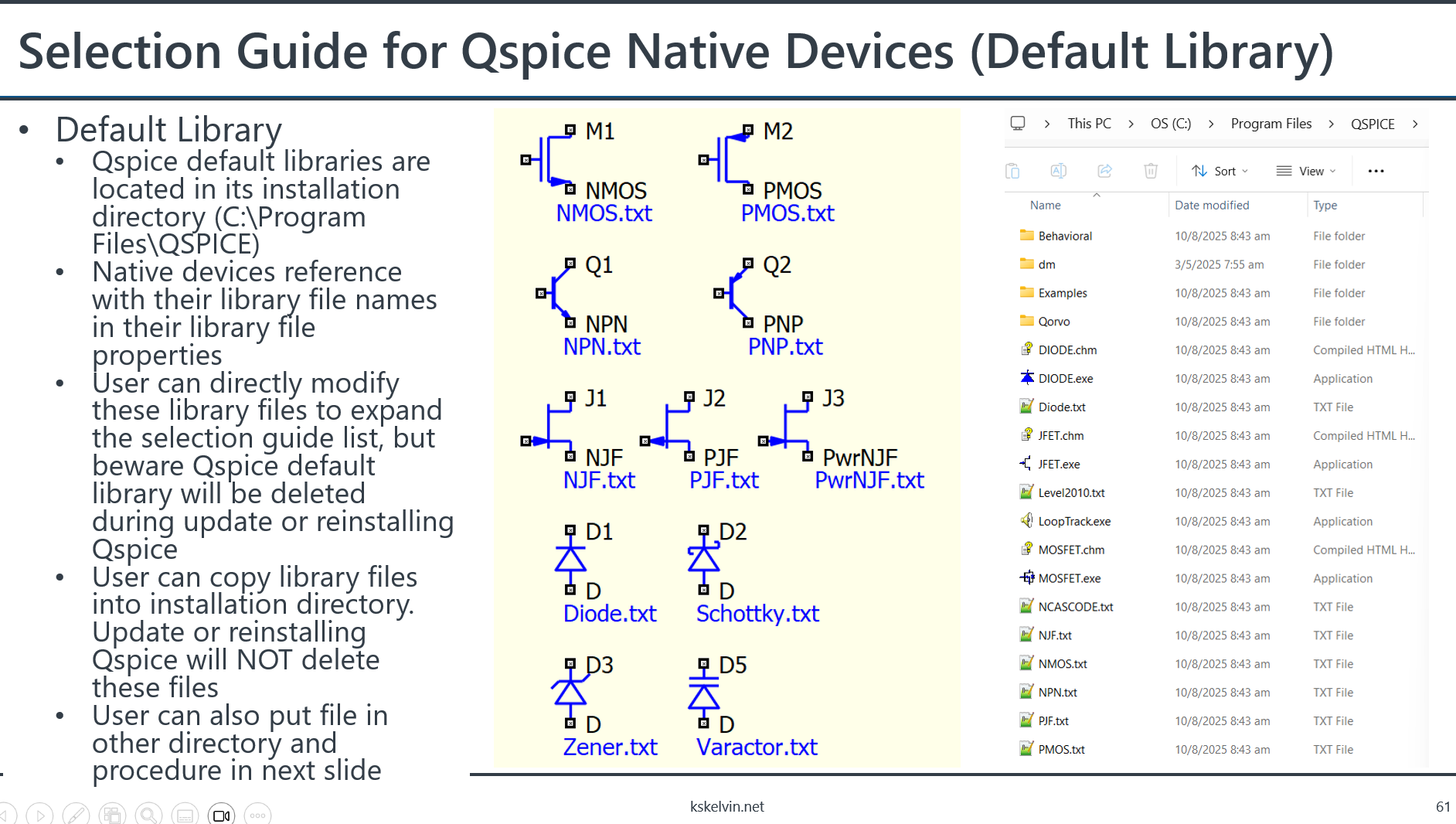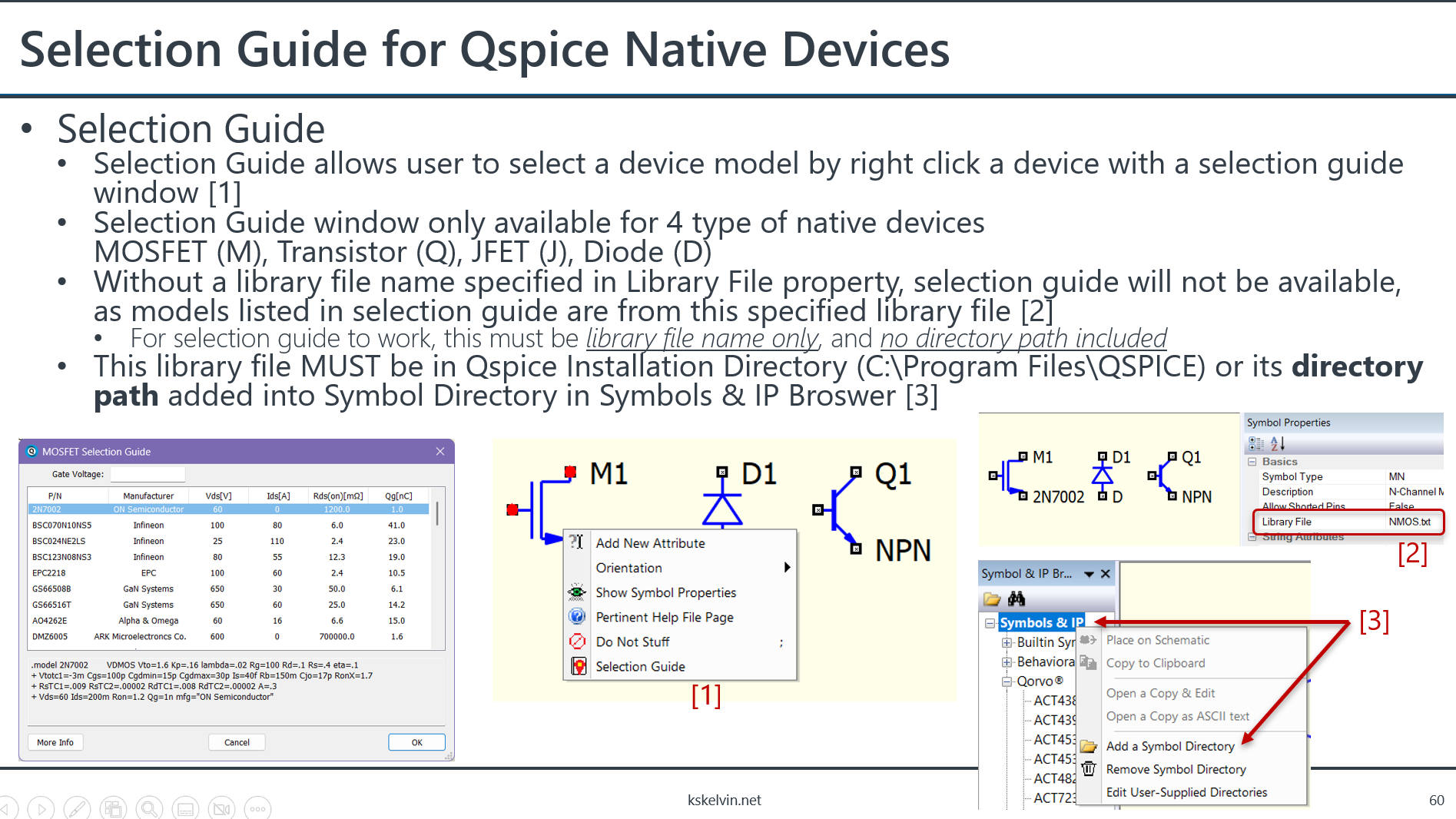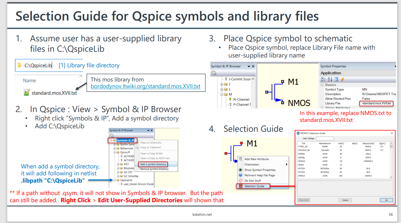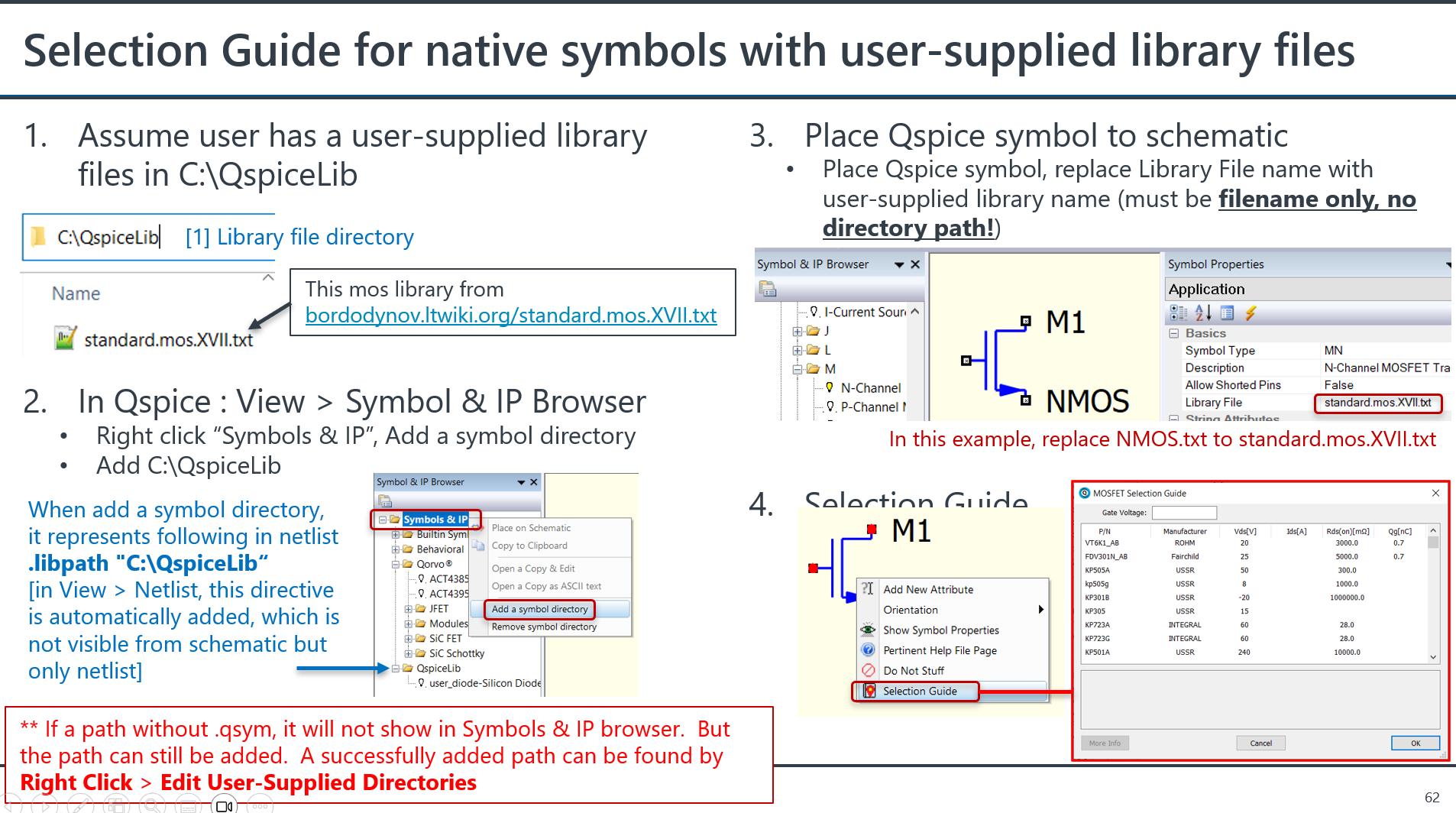 Is it still expected to work? I placed built-in NMOS symbol, added standard.mos.XVII.txt in C:\QspiceLib. I did step 2 of the slide, but didn’t see the .libpath "C:\QspiceLib" in the netlist, so I added that manually. I did step 3 with and without absolute path. No matter what I don’t see a Selection Guide. I also created my own myM.qsym in the same directory and the result is the same.