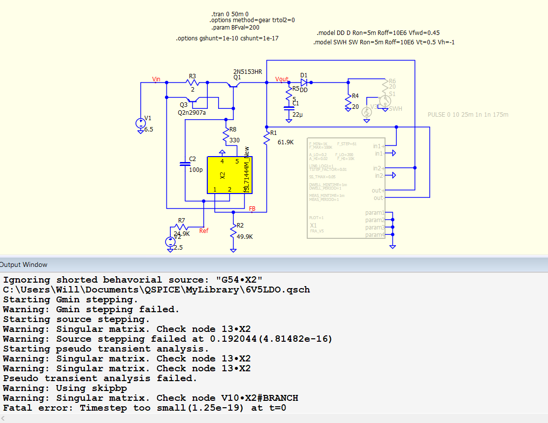 I’m not sure how to get around these errors that are coming up, I’ve tried playing woth GMIN, CSHUNT, GSHUNT, plus what you see within the options shown. Haven’t been able to make this work. I’m hoping someone can help me here.. I know the pspice model works fine within orcad and I believe within LTspice as well, not 100% sure about LTspice..