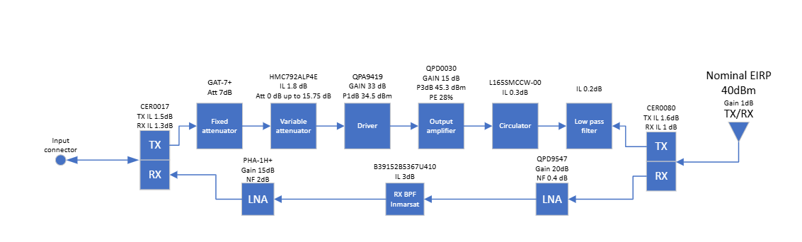 To improve thermal management, our pcb has extra copper layer inside the vias beneath the transistor. A heatsink is permanently exposed to airflow, and the board temperature appears stable after a few minutes of operation. As a driver, I’m using the QPA9419, preceded by a variable attenuator stage as shown in the block diagram. The RF section is isolated from the rest of the circuitry and enclosed in its own box, with the top wall positioned 3.07 mm above the transistor.