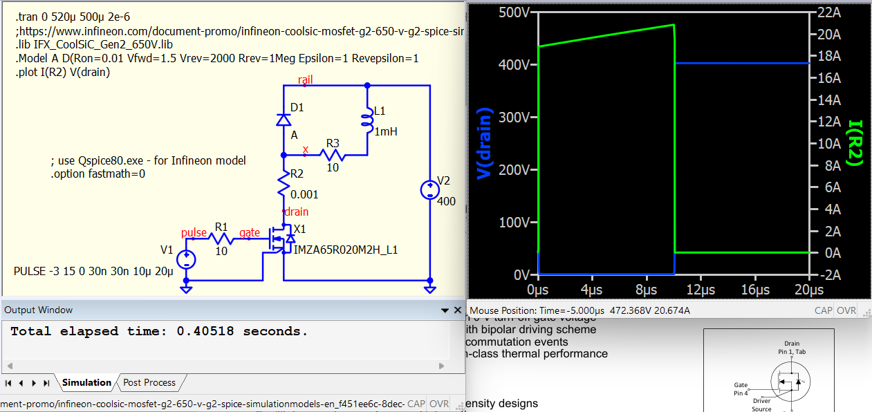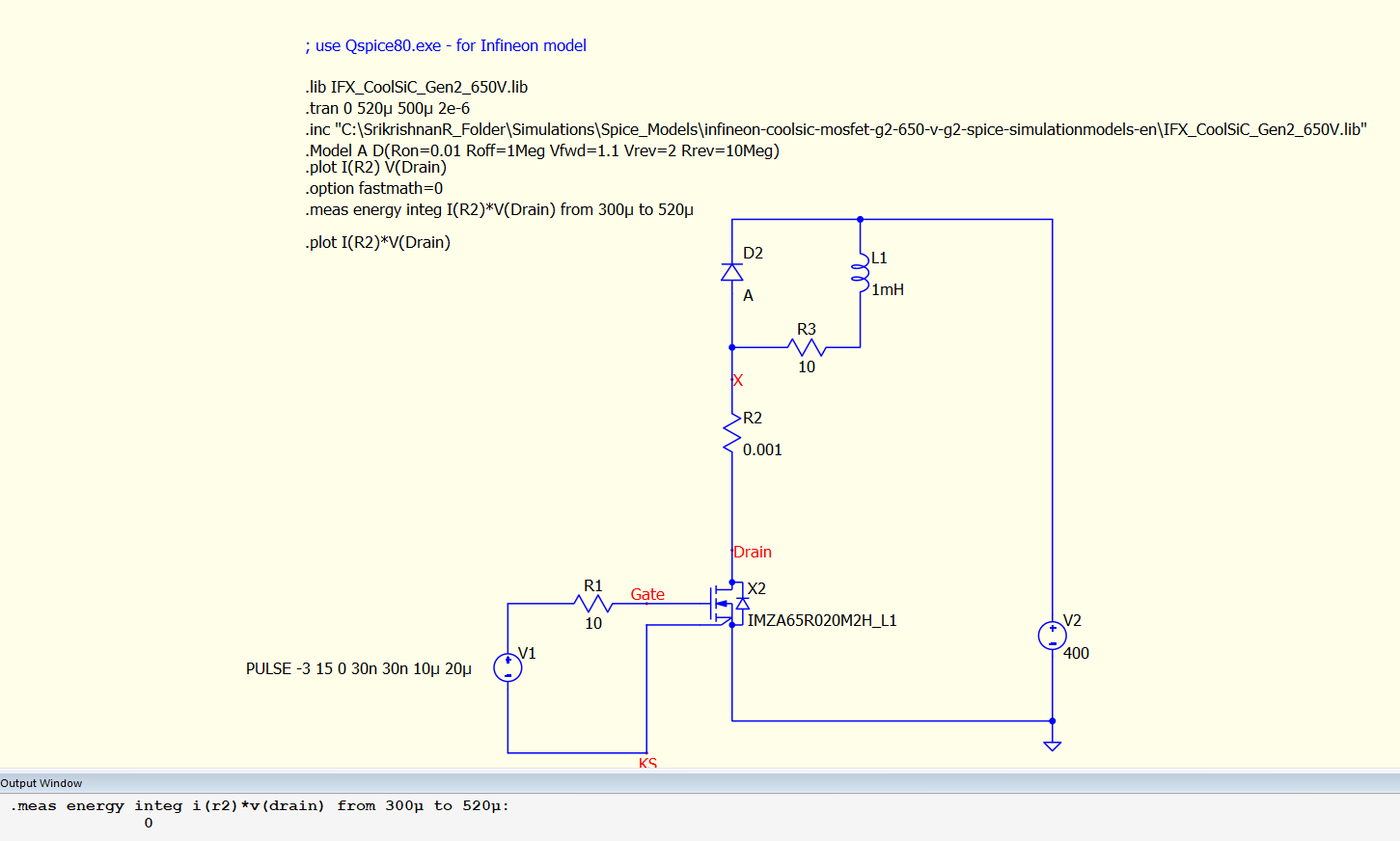 Thanks for your response. I was using LT spice for simulation extensively. Now exploring with Qspice also. LT spice doesn’t allow me to run any simulation with latest infineon spice models. But with Qspice I can run the simulation but it takes more time. A simple double pulse test circuit I’m trying to simulate, I’ve attached the simulation file.