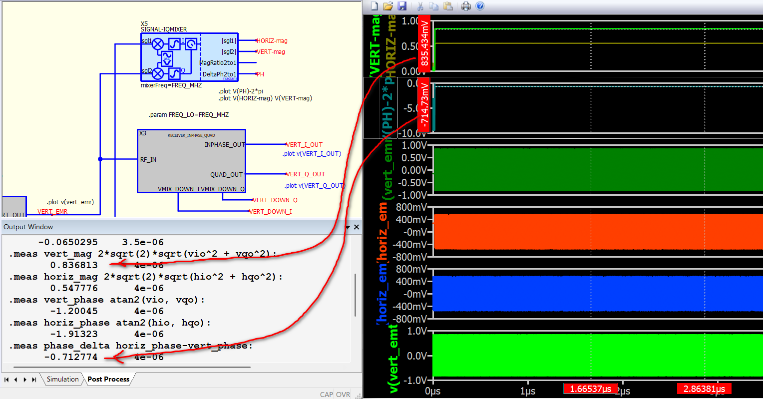 My goal on this project is to work up calibrations for a polarization measurement, to correct for various non-idealities of the IQ mixers and PCB layouts. My initial schematic with .meas’s (and your symbol!) are the ideal case and return the same parameters as fed into my antenna input. After this verification, I’m adding parasitic delay and phase tweak errors (inside the mixers) for “simulated real life”, and thereafter a calibration process to correct back (closer) to ideality.