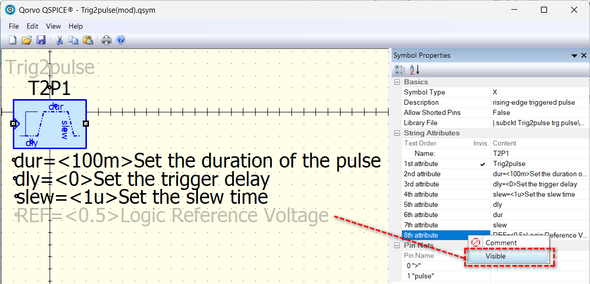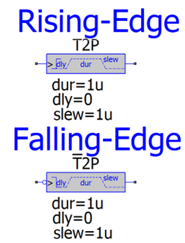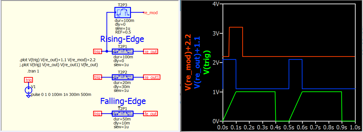 I created a edge triggered pulse generator call Trig2pulse using only symbol and subckt definitions. (ie. No C-block was used).
