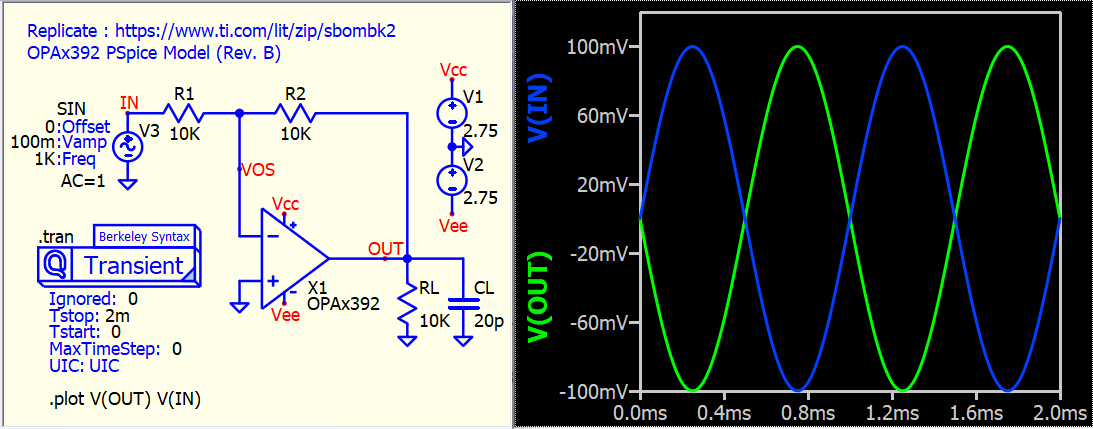 Anyway, sometimes I find that op-amp models may cause issues when operated with a single supply (even the op-amp is expected can run with single supply). I don’t have a definitive answer for this case, but assigning a negative voltage instead of GND seems to solve the problem.