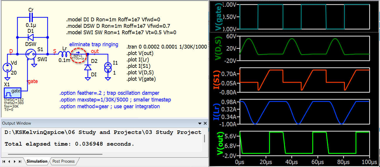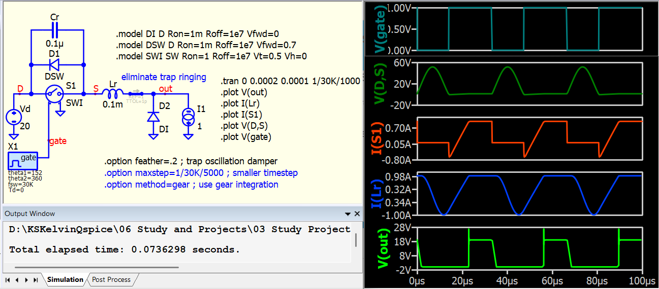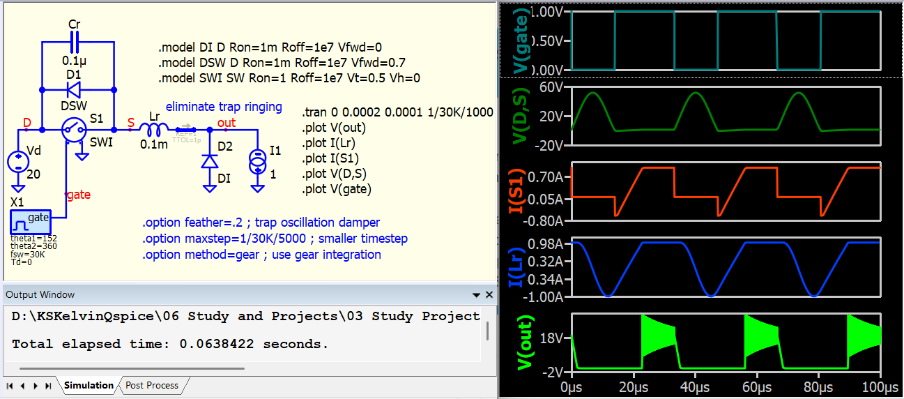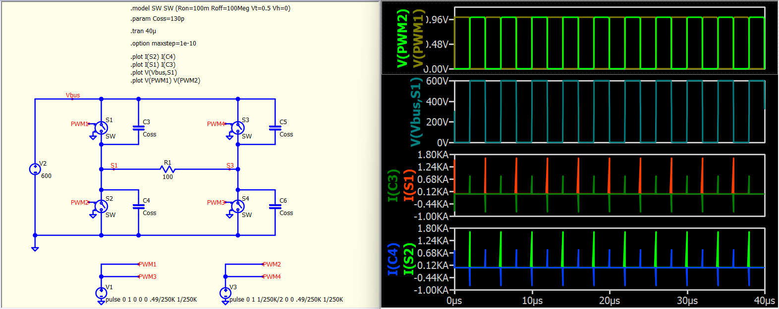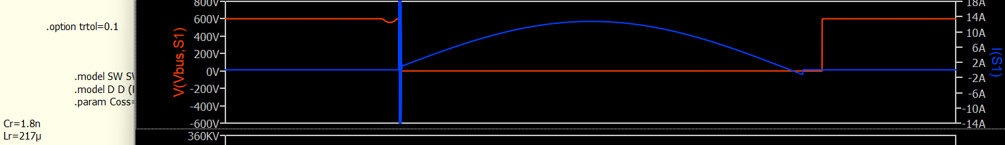 I am simulating resonant switching converters, such as LLC, and frequently encounter issues with achieving proper ZVS (Zero Voltage Switching) waveforms in QSPICE, even though the same circuit works well in LTspice. My typical setup uses an ideal switch model (.model SW SW (Ron=10m Roff=100Meg Vt=0.5 Vh=-0.2)) in parallel with an ideal diode (.model D D (Ron=1m Roff=100Meg Vfwd=1)), along with a parallel capacitor, such as 130pF.