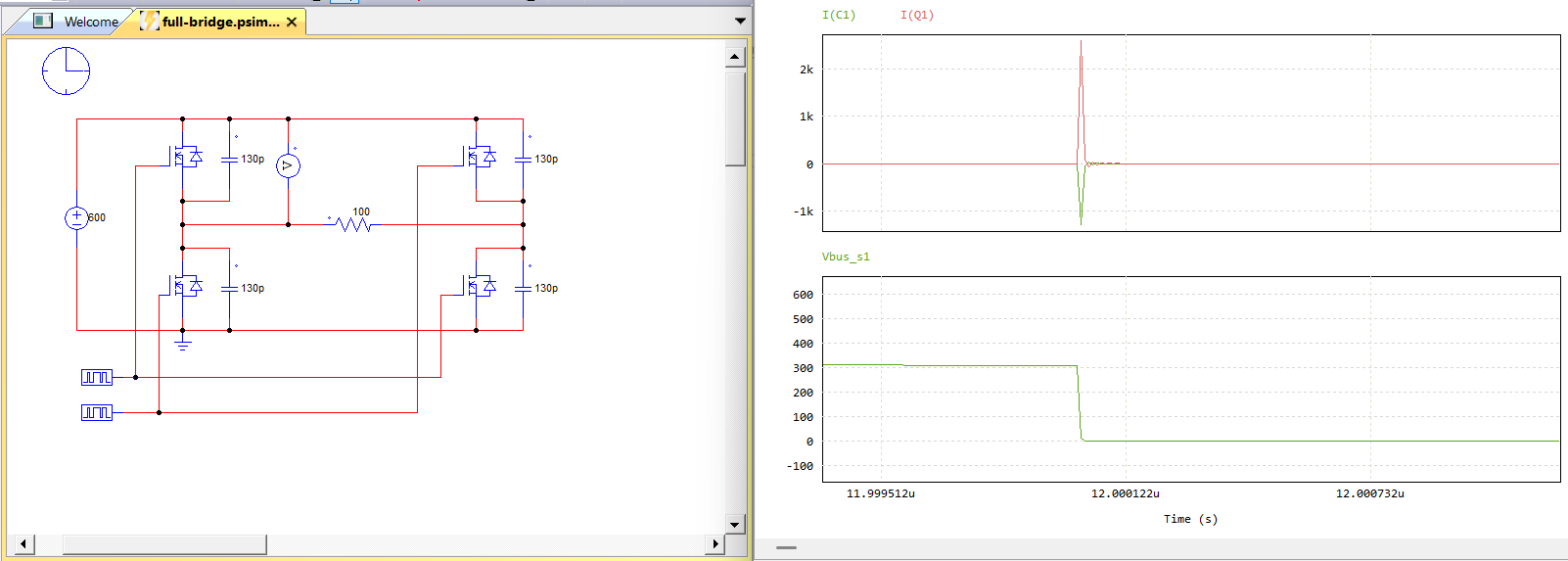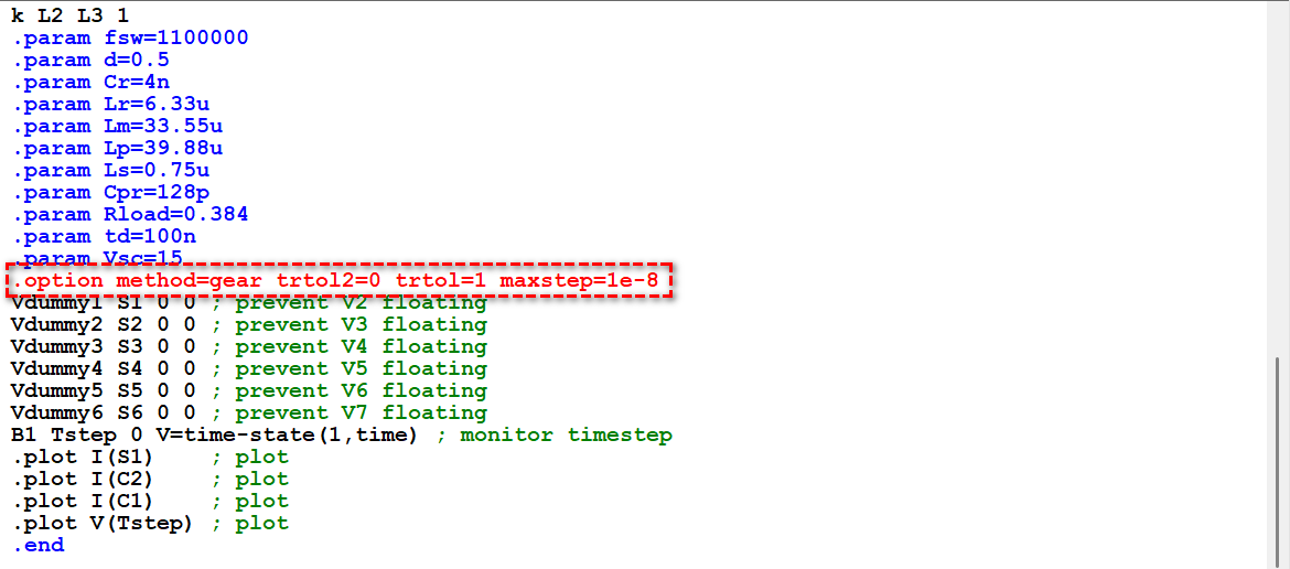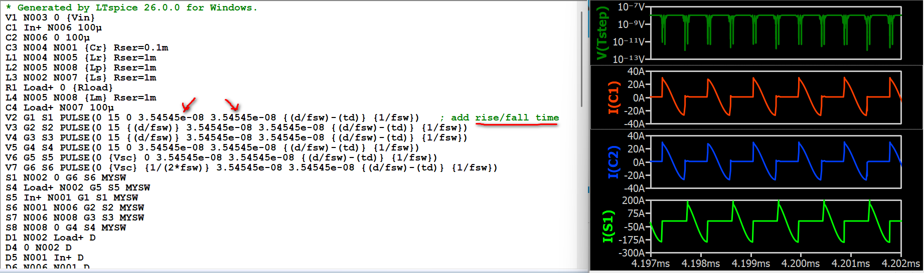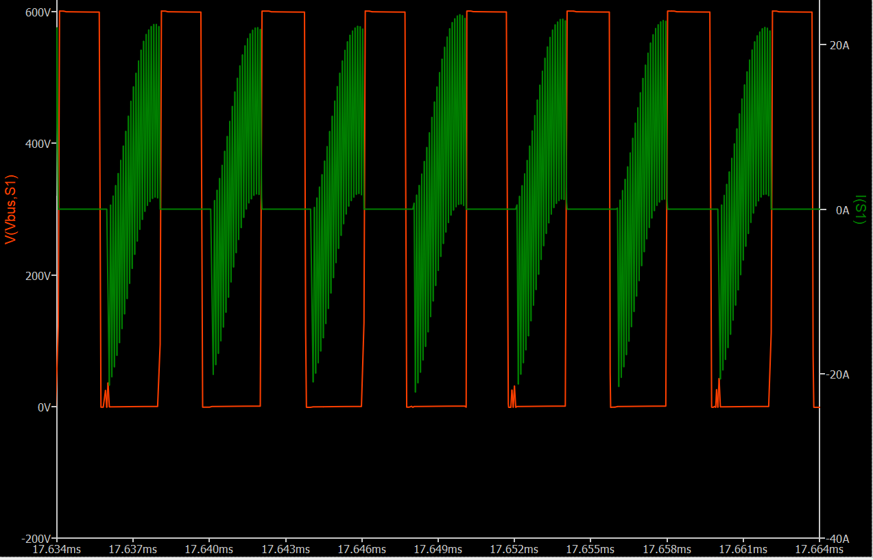 I am simulating resonant switching converters, such as LLC, and frequently encounter issues with achieving proper ZVS (Zero Voltage Switching) waveforms in QSPICE, even though the same circuit works well in LTspice. My typical setup uses an ideal switch model (.model SW SW (Ron=10m Roff=100Meg Vt=0.5 Vh=-0.2)) in parallel with an ideal diode (.model D D (Ron=1m Roff=100Meg Vfwd=1)), along with a parallel capacitor, such as 130pF.