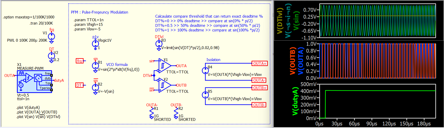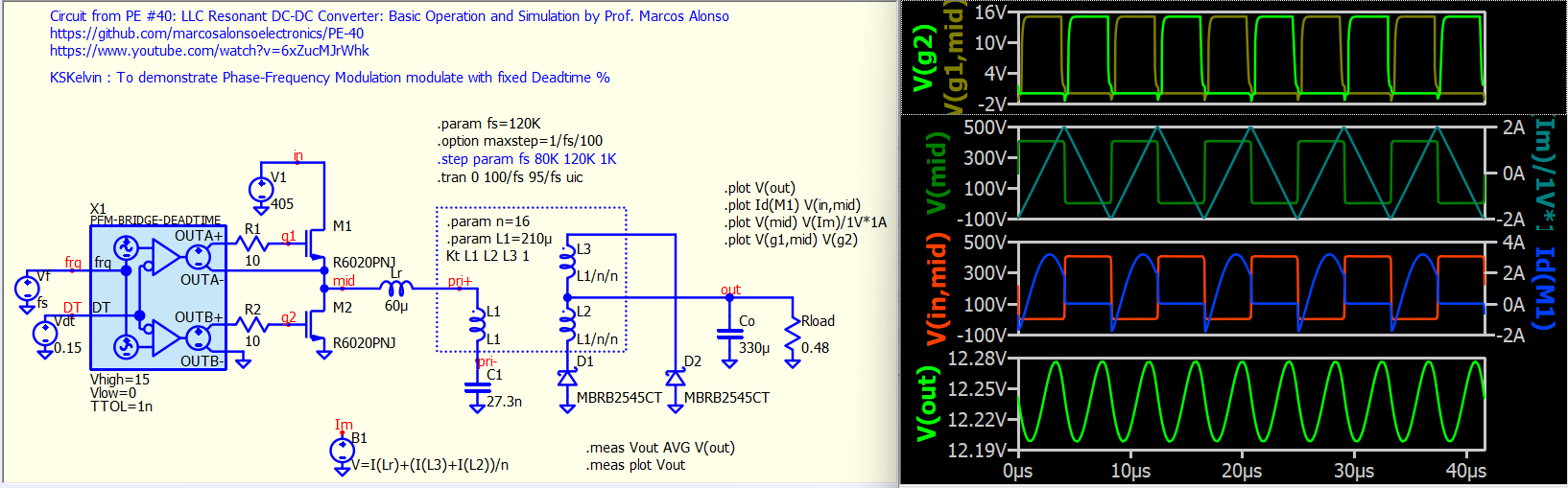 Just came across @marcos.uniovi’s YouTube tutorial that explains a LinkedIn post using a Modulator and B-source to generate a complementary gate signal with a constant dead time (which maintain the deadtime ratio when the frequency changes). This is especially useful in LLC resonant converters as their output depends on the operating frequency. Here is the YouTube link from Prof. Marcos Alonso; and LinkedIn Post from Roberto Volpini.