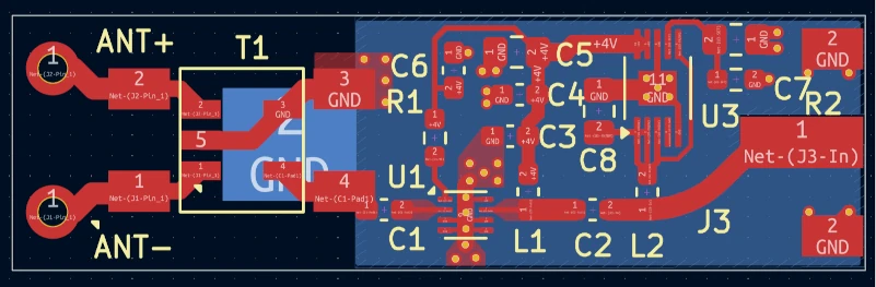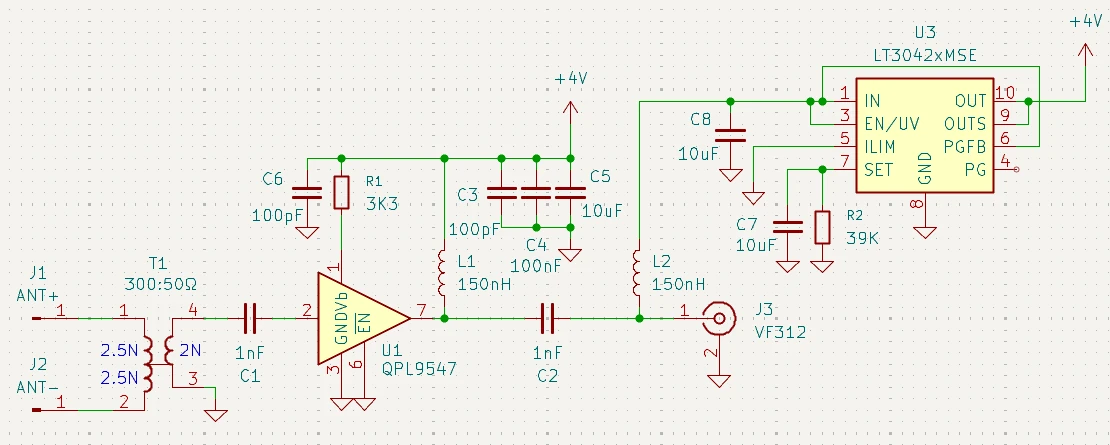 Hi, I’m using the QPL9547 on a 300 ohm balanced UHF antenna. The amp is connected to the antenna by 6" of 300 ohm twin-lead with a balun on the amp PCB. I noticed that if I touched specific points along the 6" twin-lead, oscillation would start. The spacing of these points was about 1/2λ of the oscillating frequency. (1.5Ghz and 1.8Ghz) I also noticed I could stop oscillation if I touched half way between the points that would usually start it. Touching the ground on the amp’s output coax connector or the coax itself near the amp PCB could invoke oscillation as well.