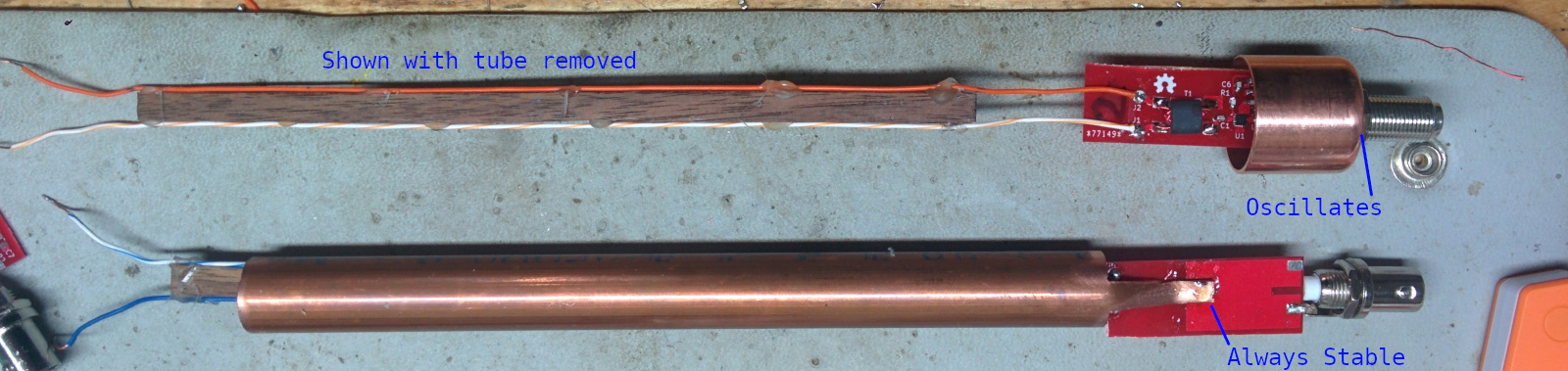 I also noticed lengthening the shield tube’s connection to the PCB ground beyond 3/4" would make it prone to oscillation.