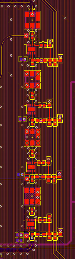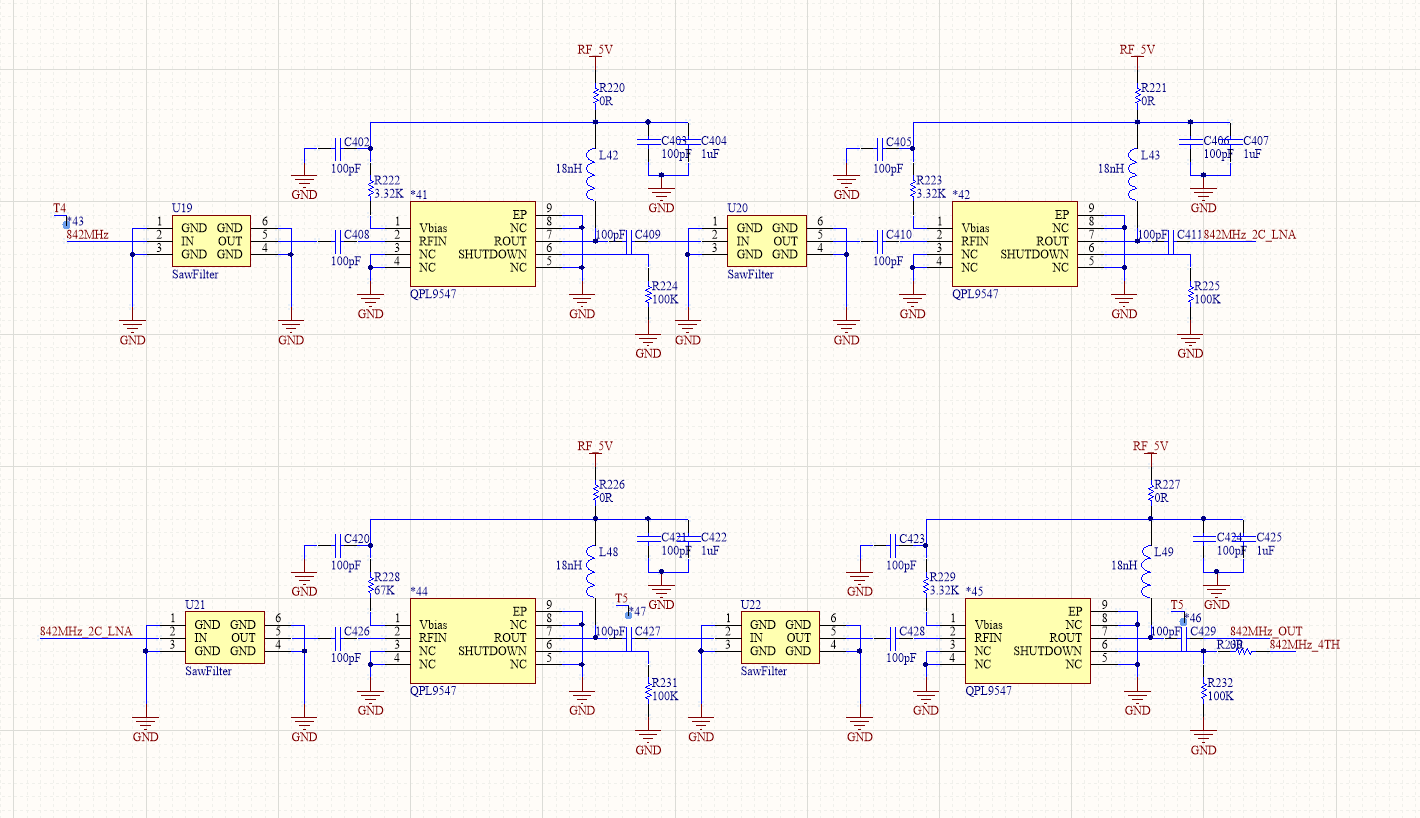 Thank you for your reply. However, when I test them separately, the voltage across the 3.32k resistor on the first QPL9547 is only 0.9V. It has never worked properly. I also individually tested each LNA; the others are around 1.1V. Calculated, its current is 1.2mA. I want to know if this incorrect bias voltage is the reason it is not working properly. Should I evaluate the total current of the whole 9547 to check if it is working correctly? I measured 58mA under 5V when it is working, but only about 4mA when not working. However, I don’t understand why it can’t operate normally. My power supply ripple is very small. Could it be that matching issues are causing it to be unstable, leaving the bias voltage in an abnormal state?