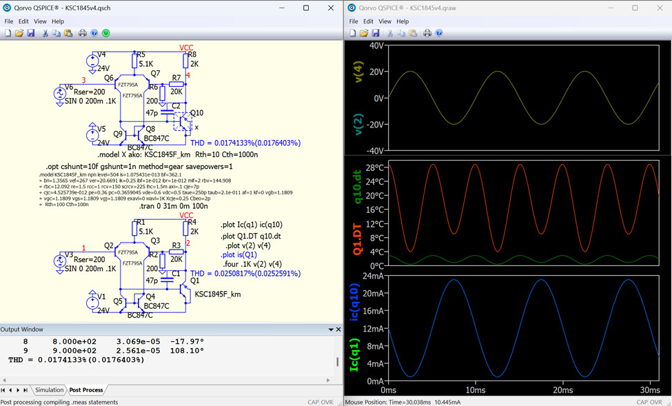 For this week’s QSPICE schematic capture, we have “KSC1845v4” by our friend Alexander Bordodynov. “I made a simple circuit and a copy of it using an output transistor radiator. The radiator reduces the thermal resistance and increases the heat capacity. By the way, germanium transistors have a much higher heat capacity. Compare the specific heat of silicon and germanium - there is a huge difference. Perhaps that’s why many people like to listen to germanium amplifiers.” Please send any submissions to tim.mccune@qorvo.com (Schematic Capture Post #069)