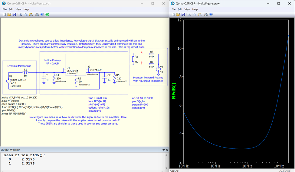 This schematic capture is one by our own Mike Engelhardt. “Dynamic microphones source a low impedance, low voltage signal that can usually be improved with an in-line preamp. There are many commercially available. Unfortunately, they usually don’t terminate the mic and many dynamic mics perform better with termination to dampen resonances in the mic. This is the circuit I use.” This schematic capture is in the QSPICE® release under File=>Open Demo…=>NoiseFigure. Please send any submissions to tim.mccune@qorvo.com. (Schematic Capture Post #072)