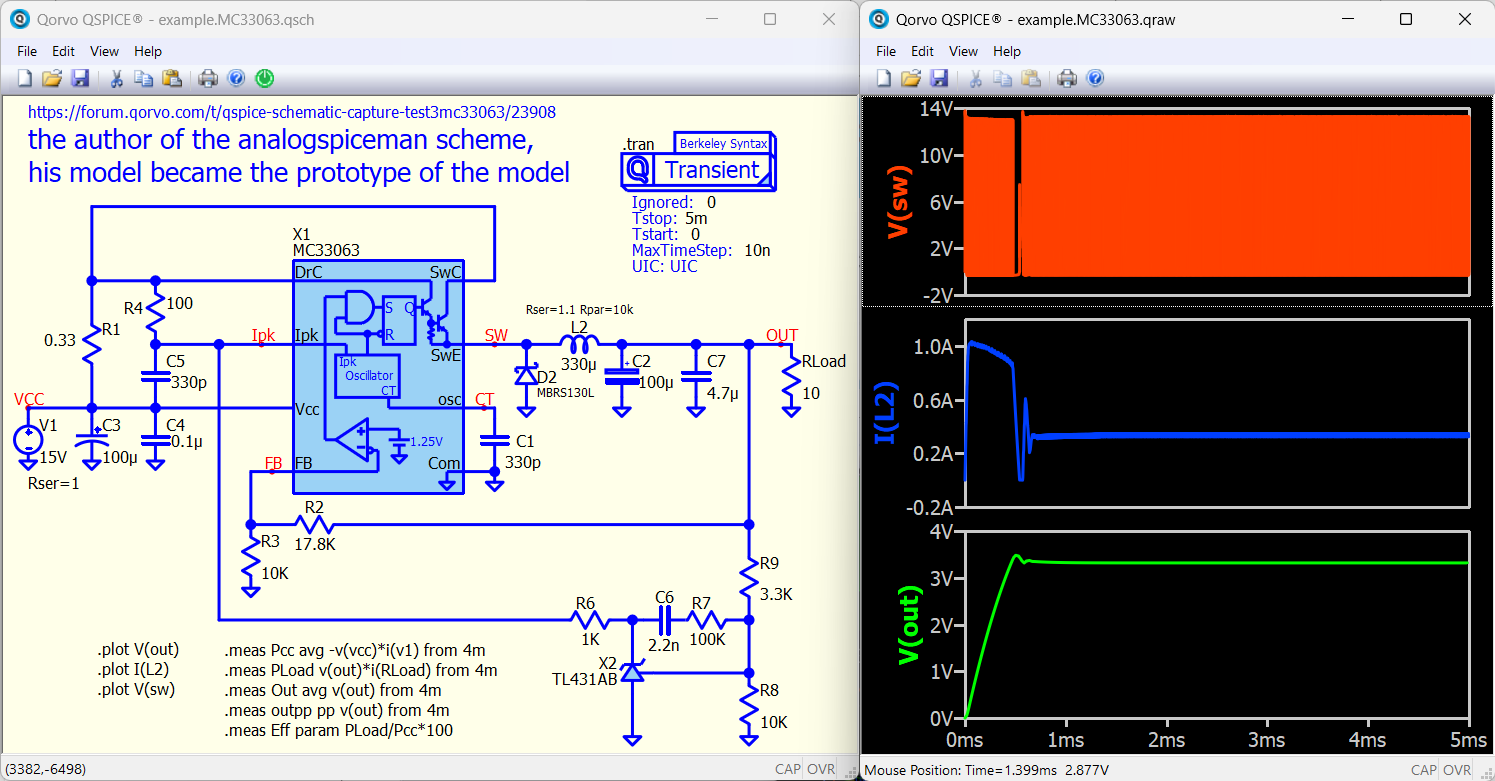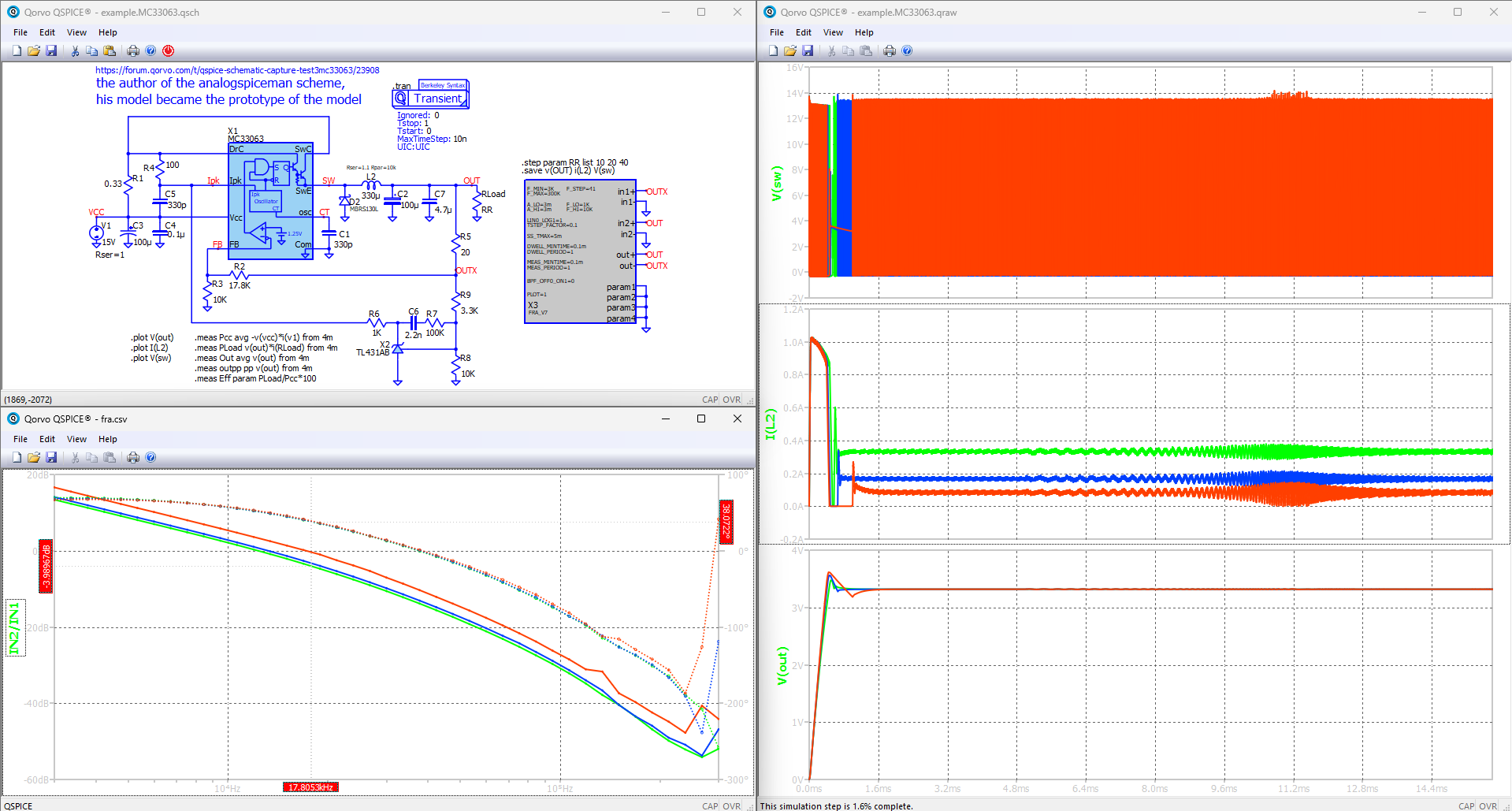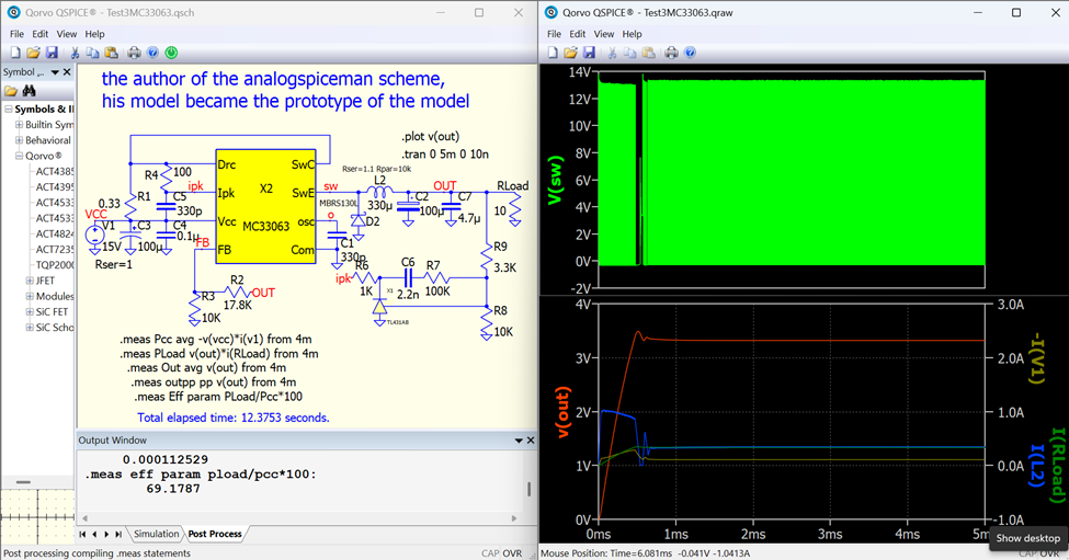 For this week’s QSPICE schematic capture, we have “Test3MC33063” by our friend Alexander Bordodynov. “Here is a non-standard application of the well-known MC33063 chip. At the same time, the improved parameters fully pay for the complexity of the scheme. The idea is from analogspiceman (our late friend Dave Edwards). I adapted his model for QSPICE®.” (Schematic Capture Post #051) Please send any submissions to tim.mccune@qorvo.com.