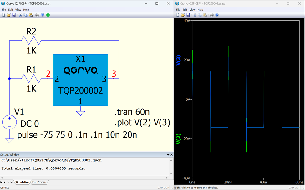 This schematic capture is one by our own Mike Engelhardt. It illustrates good modeling methodology, resulting in better models than otherwise exist. The Qorvo® TQP200002 is an ESD protection device built using GaAs MESFET technology for use in high-frequency circuits. This schematic capture is in the QSPICE release under the Symbols & IP Browser, TQP200002.qsch. Please send any submissions to tim.mccune@qorvo.com (Schematic Capture Post #074)
