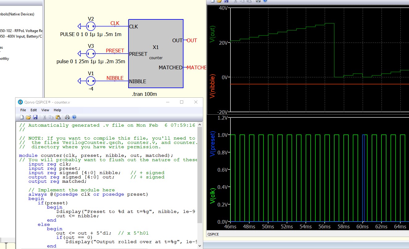 For this week’s QSPICE schematic capture, we have “Verilog Counter,” one of the demonstration ones Mike created to show various QSPICE features and capabilities. (Schematic Capture Post #043) For more on using C++ and Verilog in QSPICE®, please check out this video: HowToC++