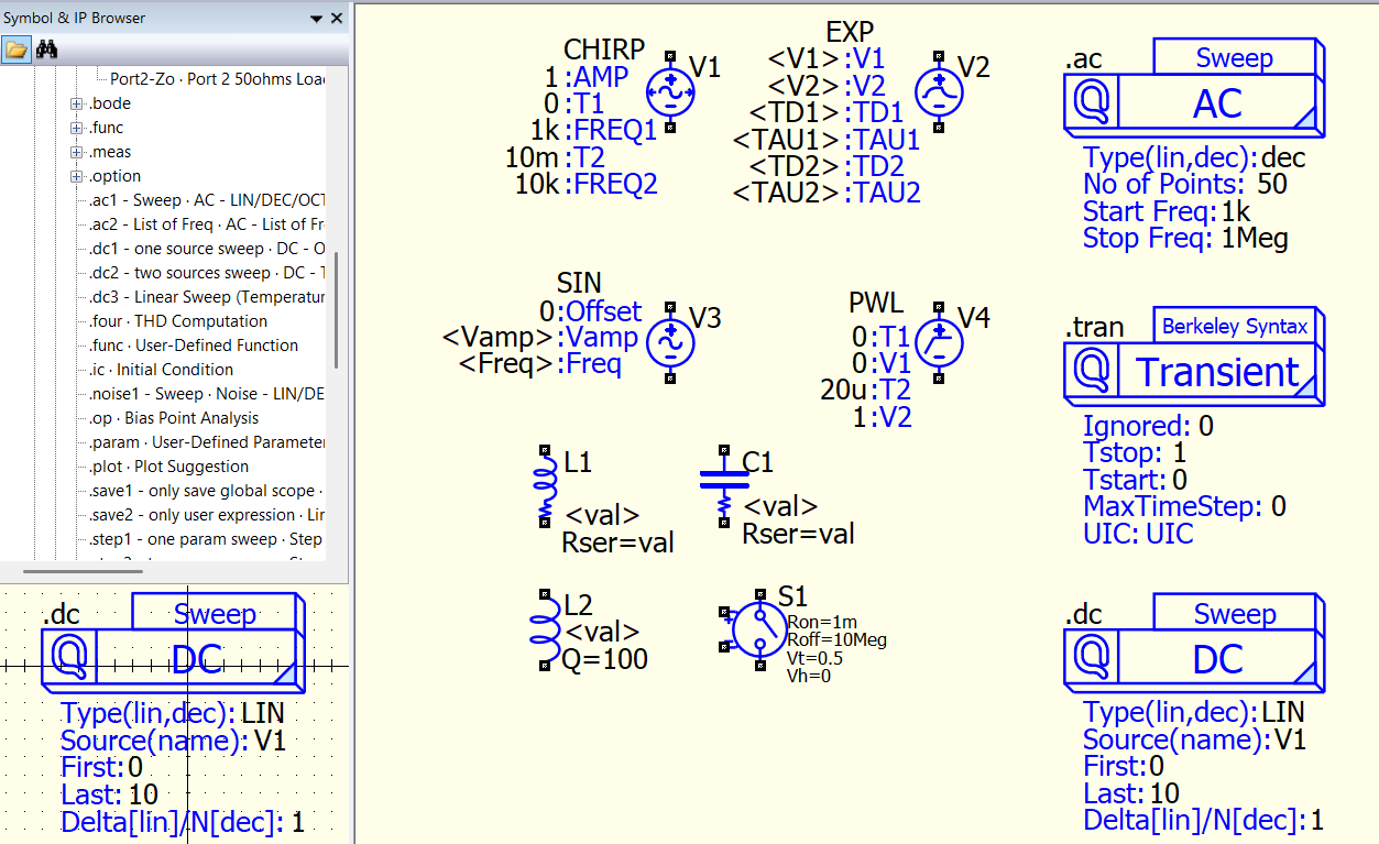1 Voltage sources dont have a GUI pop up that LTSpice has. It is the same syntax and often i type in LTSpice since there it is easier to write since you can see what parameter you change.