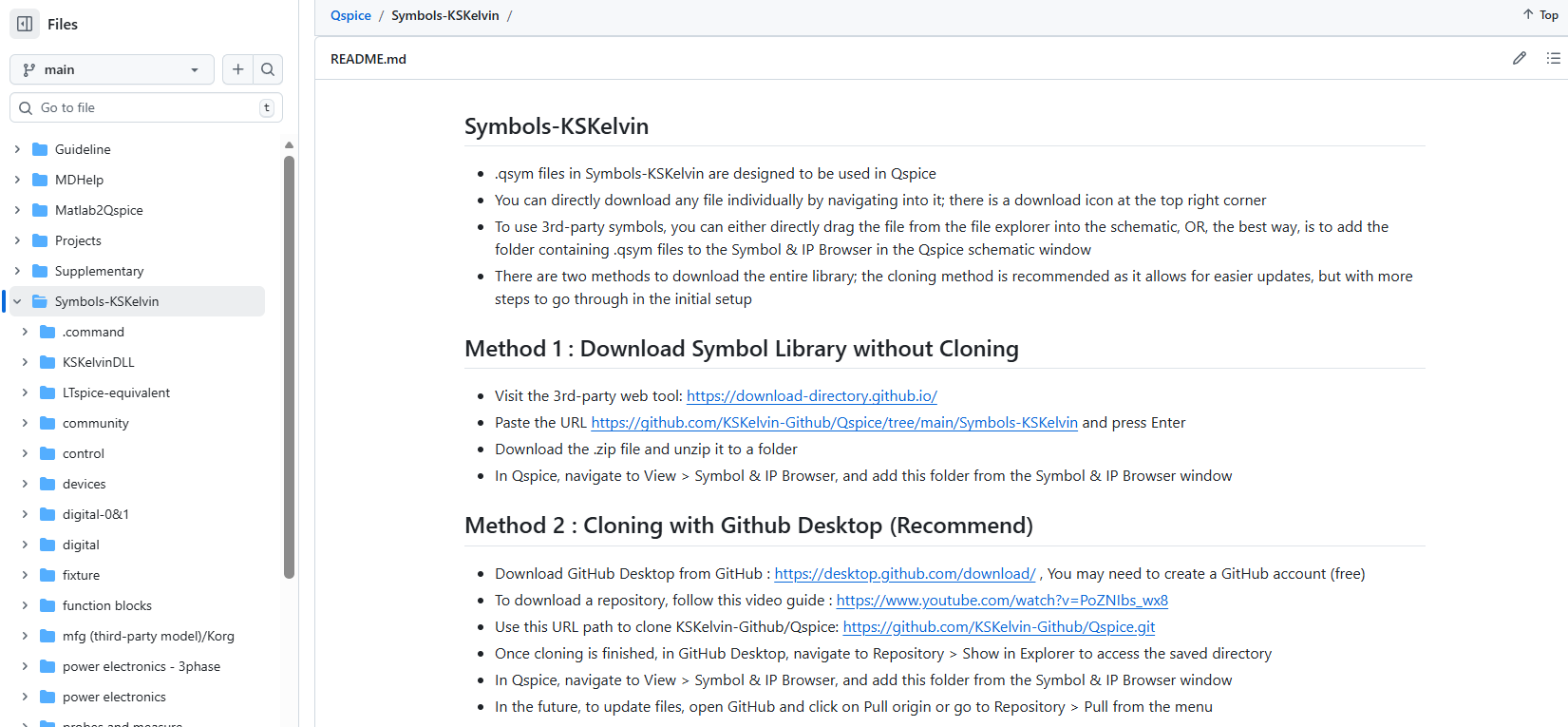 In my Github link, navigate to Symbols-KSKelvin, scroll down to the bottom, and it will display the contents of README.md, explaining how to download the entire library and add it to Qspice. Is this what you are looking for?