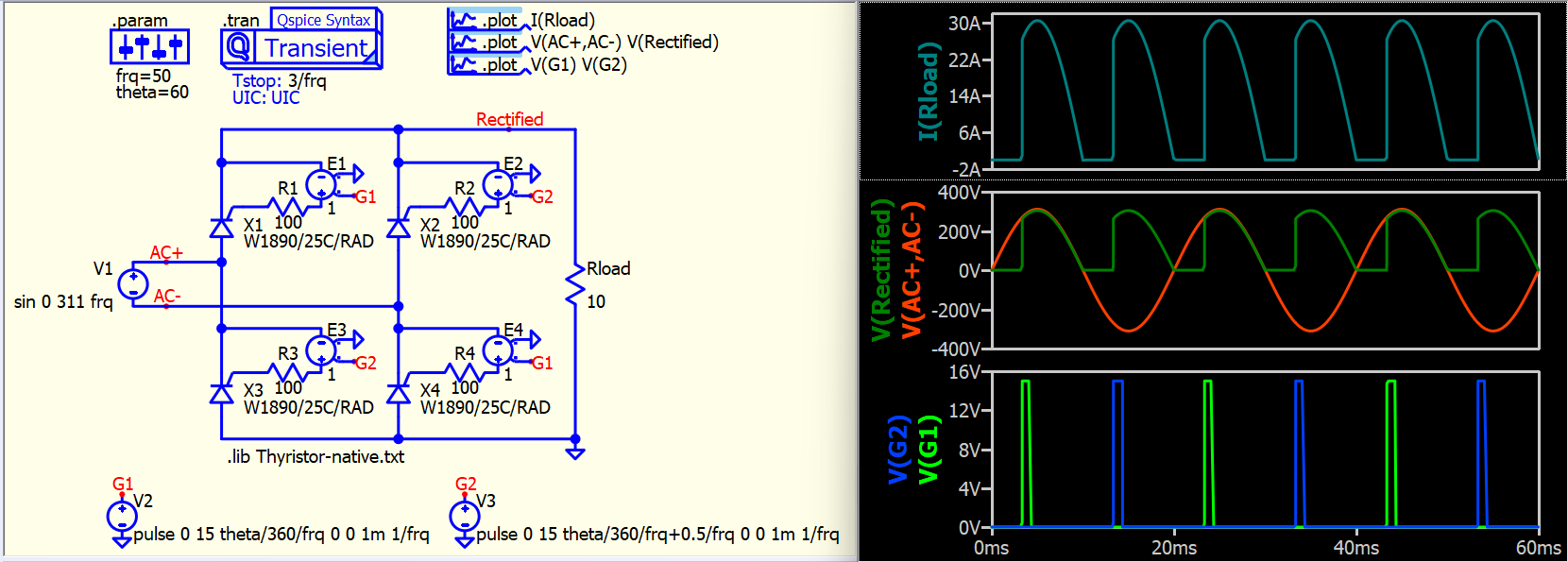 I’m new to QSPICE and need to simulate a single-phase rectifier controlled by an SCR (thyristor). I want to be able to trigger it from 0º to 180º. I couldn’t find the component in question in the QSPICE library. How do I add an SCR to QSPICE? And how do I trigger it at a specific angle? I’d appreciate any help. I’m new and still learning.