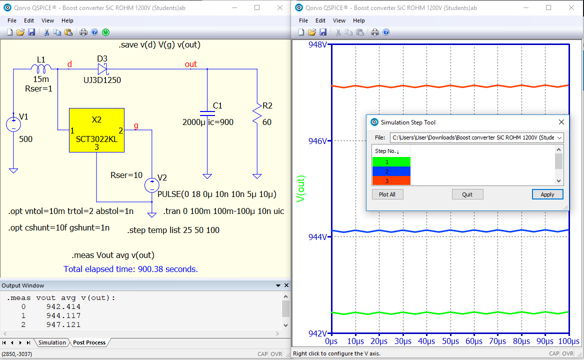 I am simulating a boost converter using a SiC MOSFET and would like to run the circuit at different temperatures to analyze the MOSFET’s switching behavior. However, the simulation is taking an excessively long time to run, and I suspect this may be due to convergence issues.