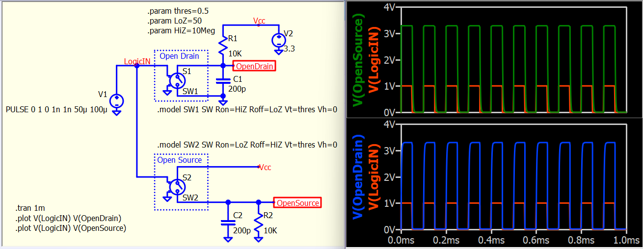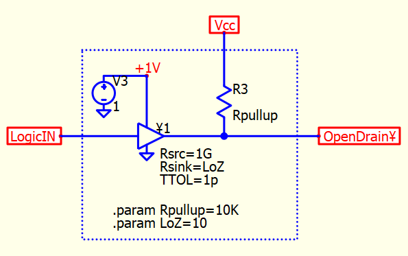 All logic components ( ¥-Device) have attributes called RSRC and RSINK. These components allow me to simulate either Open Collector/Drain or Open Emitter/Source logic outputs.