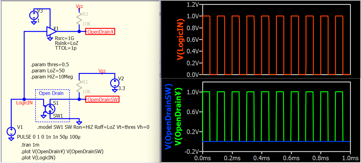Here lies a fundamental difference in using a ¥-device versus a switch to model the behavior of an open-drain condition. In the absence of a external pull-up resistor, an open-drain should have no output, but the Rsrc of a ¥-device serves as a built-in pull-up that cannot be removed, and can output HIGH (or more precise - Vdd of ¥-device) even without external pull-up.